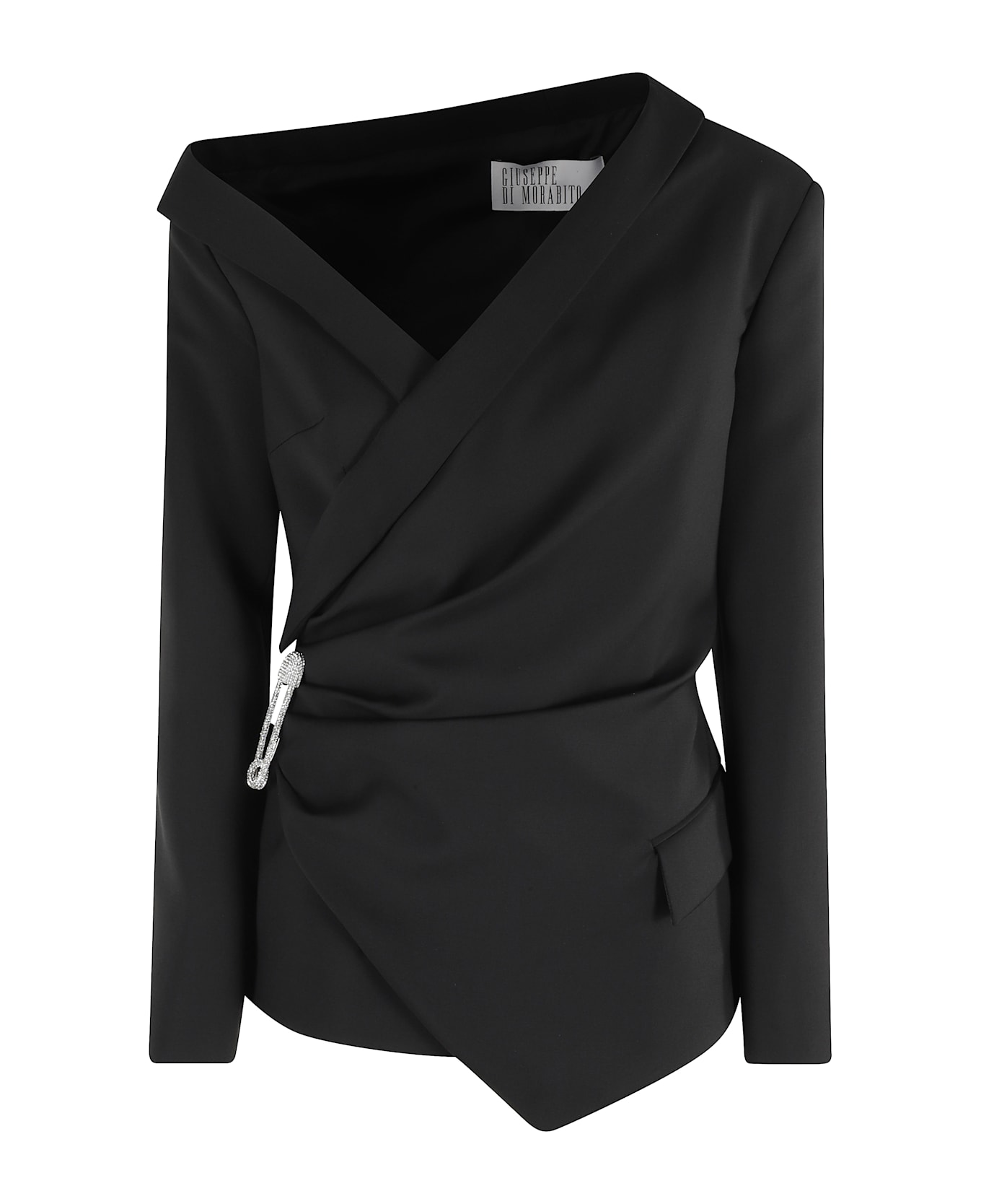 Blazer - Giuseppe Di Morabito - Black color - Wool canvas fabric - Asymmetrical neckline - Padded shoulder straps - Draped design - Asymmetrical rhinestone pin closure