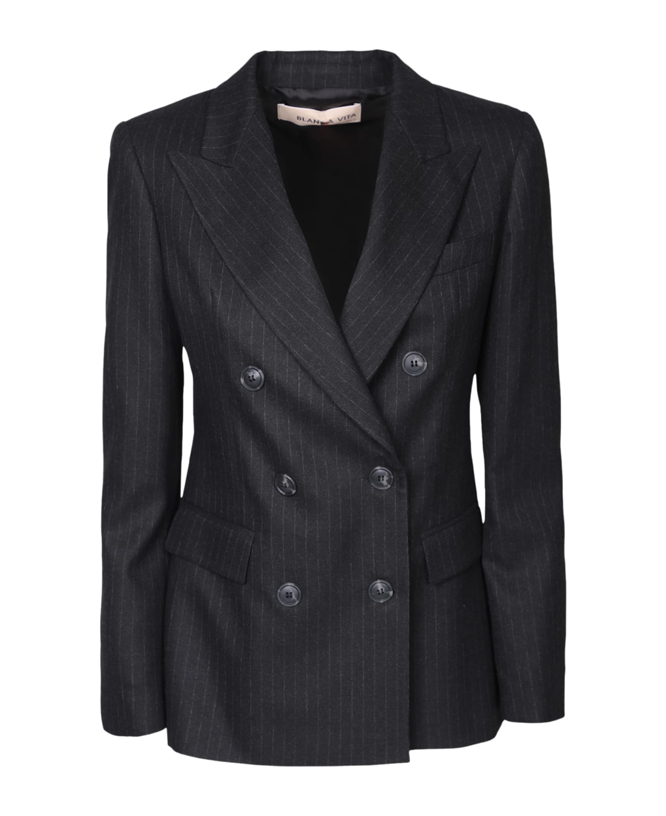Peak lapels. Double-breasted. Front button fastening. Long sleeves. Two side flap pockets. Chest pocket. Central back slit. Pinstripe design. Color: black