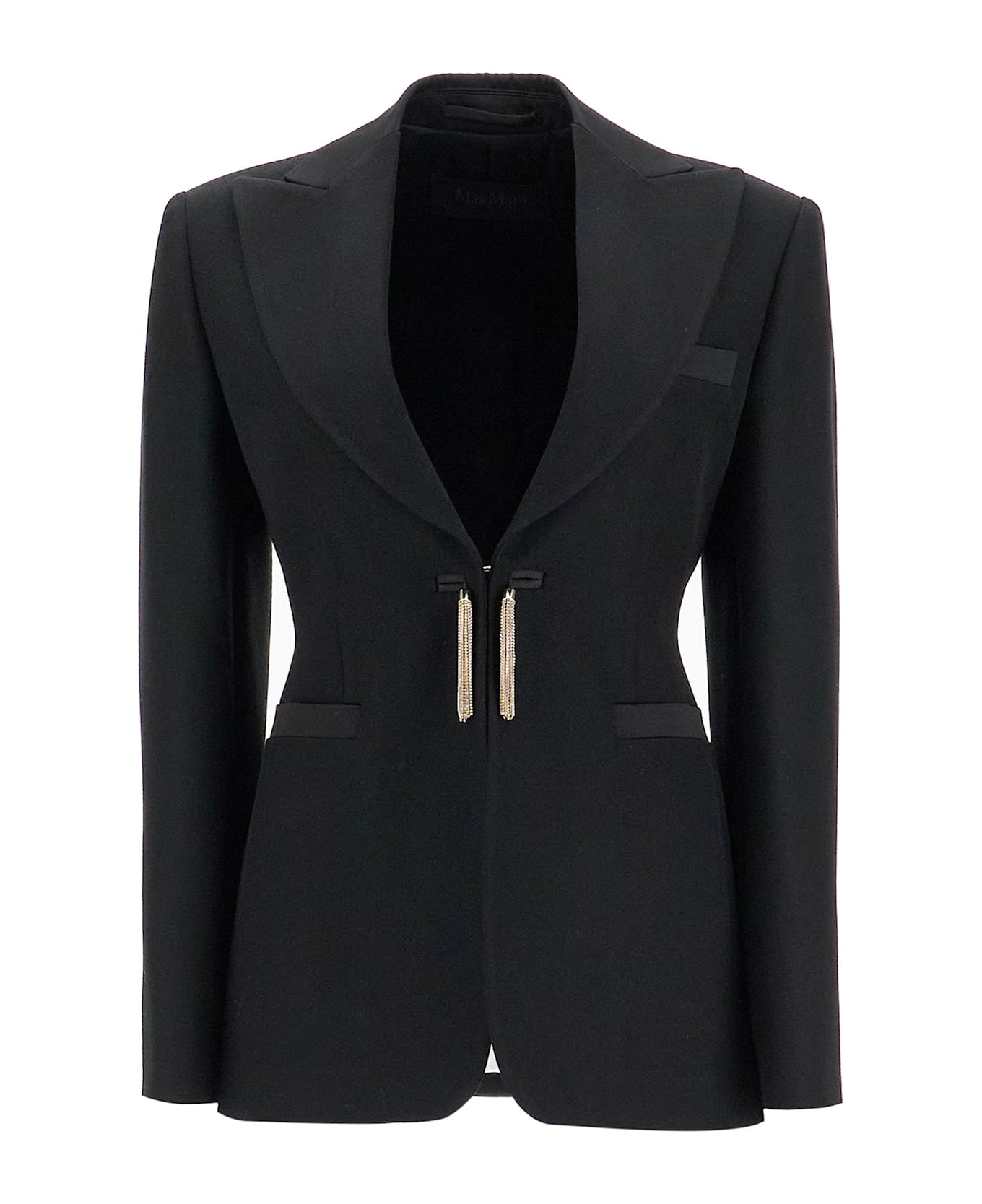 The Max Mara Pianaforte collection presents the Blazer smoking, made of pure wool gran poudre and closed with a decorated piercing featuring two jewel tassels. It features a shawl collar, flap pockets, and a chest pocket for men, as well as a central slit at the back. The interior is lined and the fit is slim with padded shoulders. The model is 177 cm tall and wears size IT 40.