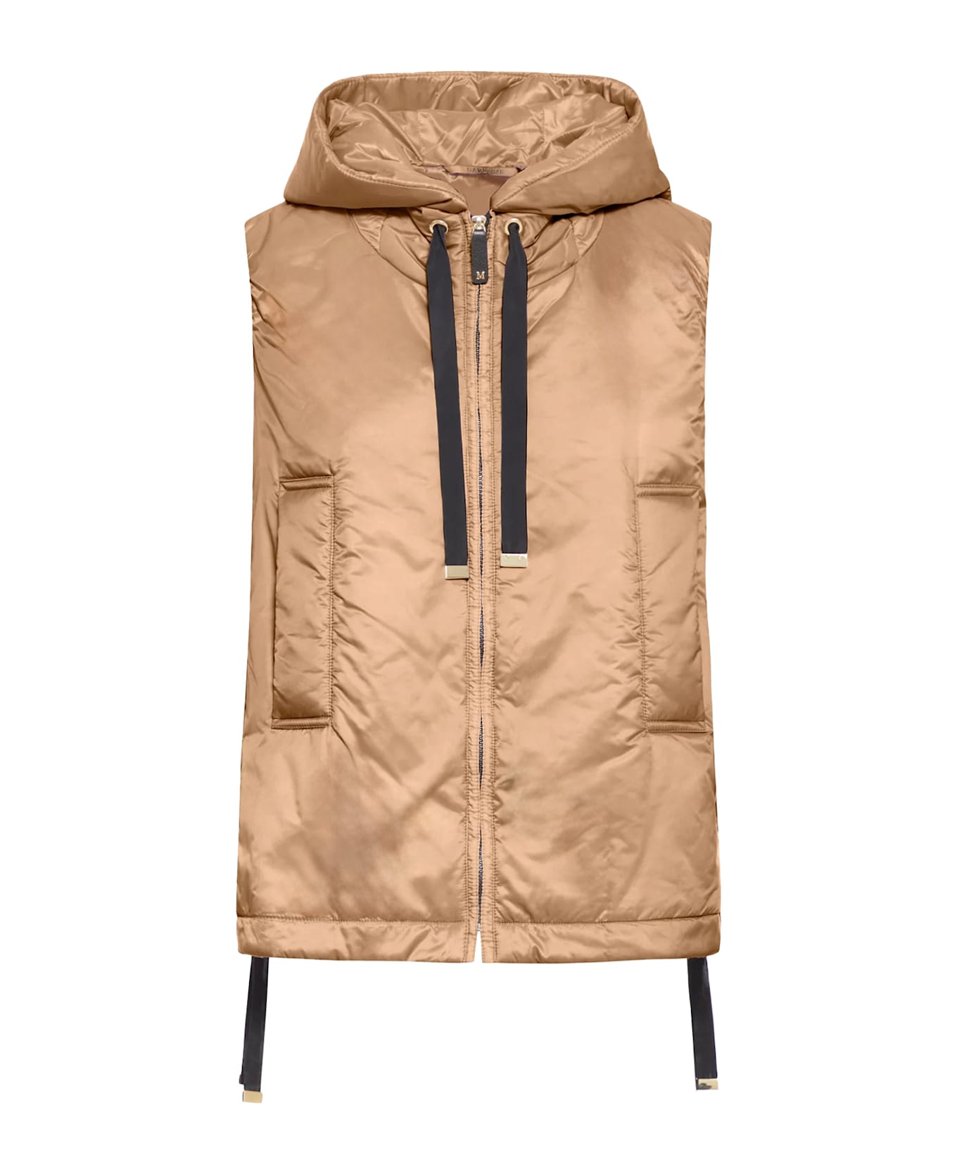 Zip closure with logo leather slider Hood with drawstring Bottom with adjustable drawstring Double vertical pocket 100% polyester Padding: 48% polyester 48% camel 4% silk SKU: 2529296024600051