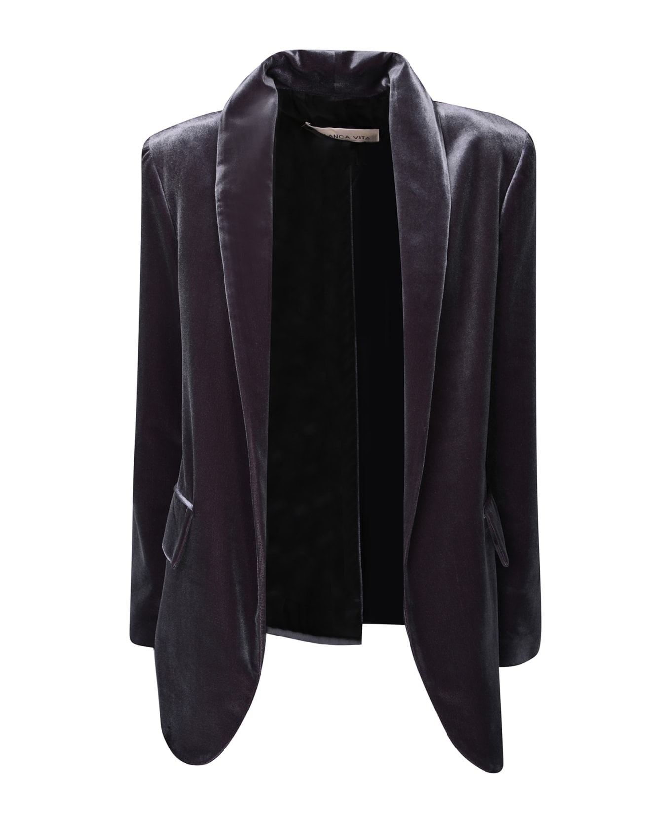 Shawl lapels. Single-breasted. No fastening. Long sleeves. Two side flap pockets. Rear slit. Tone-on-tone stitching. Regular fit. Curved hem. Color: grey