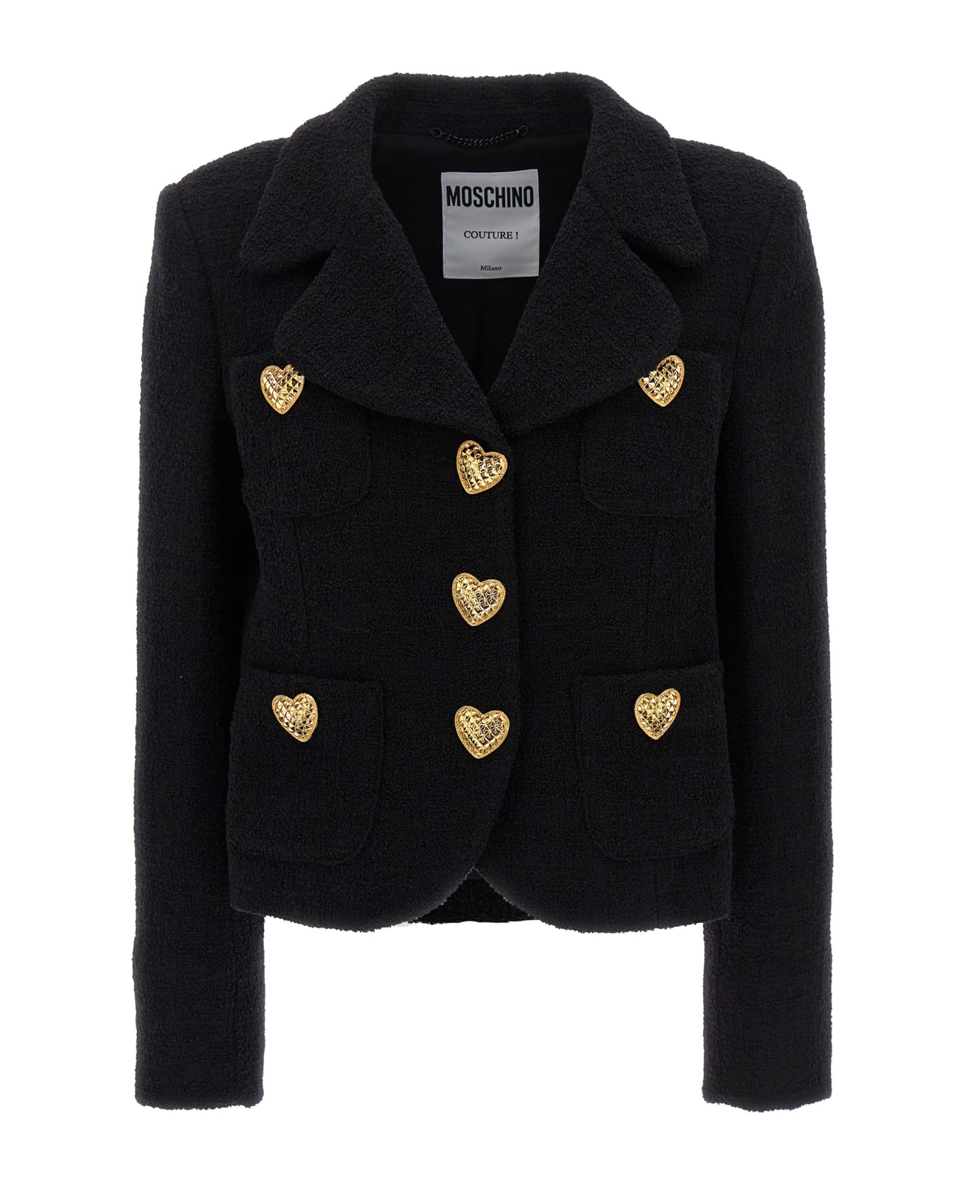 Bouclè wool blend blazer with 'Hearts' button closure, pockets, long sleeves. Composition: 89% wool, 11% polyamide