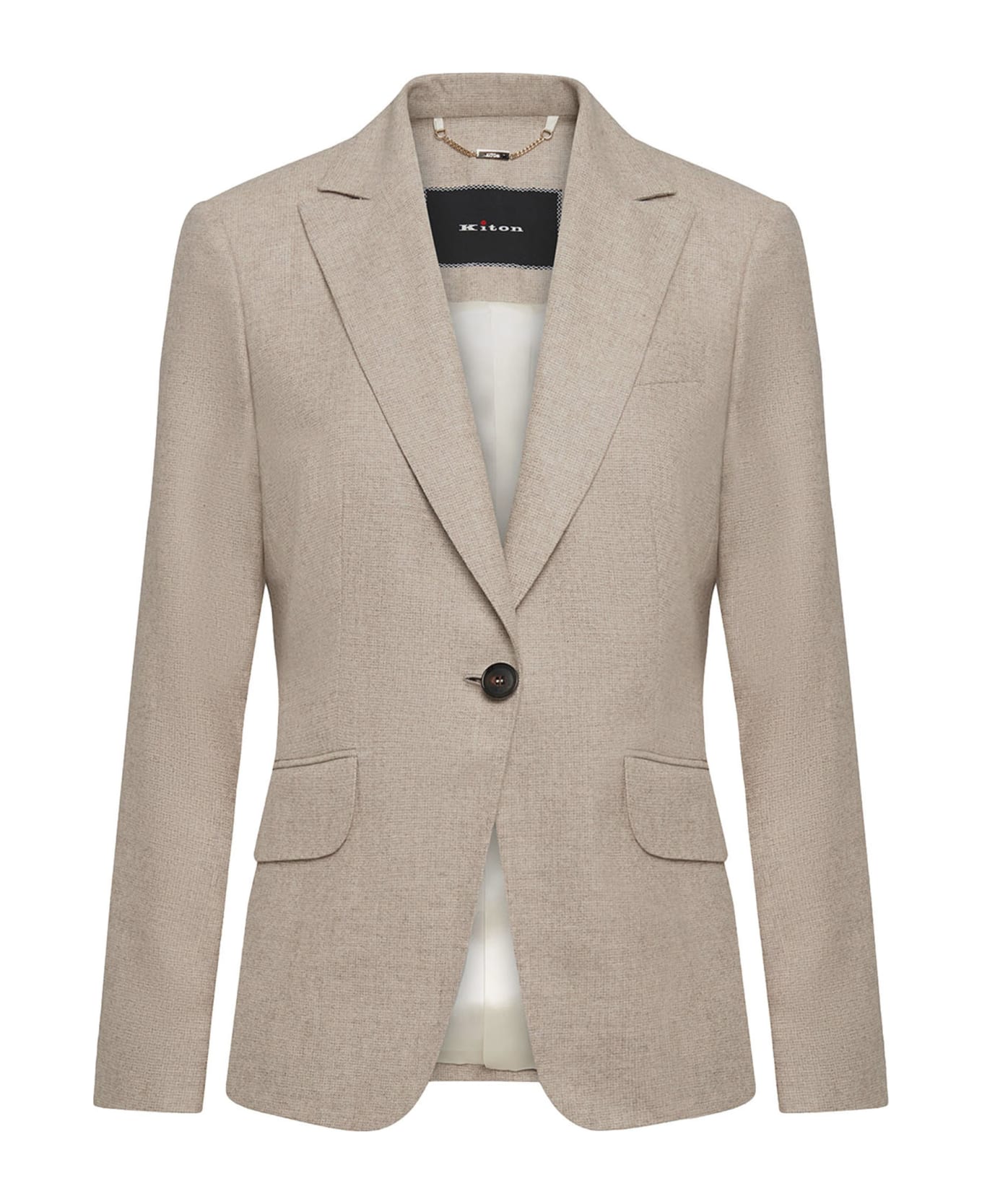Single-breasted jacket made from fine beige cashmere, with a clean design and essential lines. This is one of the brand s most iconic jacket styles, embodying Kiton s sartorial savoir-faire: the brand s mastery of complex textile production processes is expressed through feminine tastes and needs. The jacket features pointed lapels, a single button, a breast pocket and two welt pockets with flaps on each side. The garment is fully lined in printed pure silk satin. Every Kiton jacket is a masterpiece of design, entirely cut and sewn by hand in Naples by 25 master tailors who carry out 1800 steps to complete such fine architectural attire. Perfect for formal occasions, this Kiton garment speaks to refined women with strong, passionate character, attentive connoisseurs of the sartorial traditions that it represents. To maintain the beauty of your Kiton jacket, we recommend professional laundering and pressing.