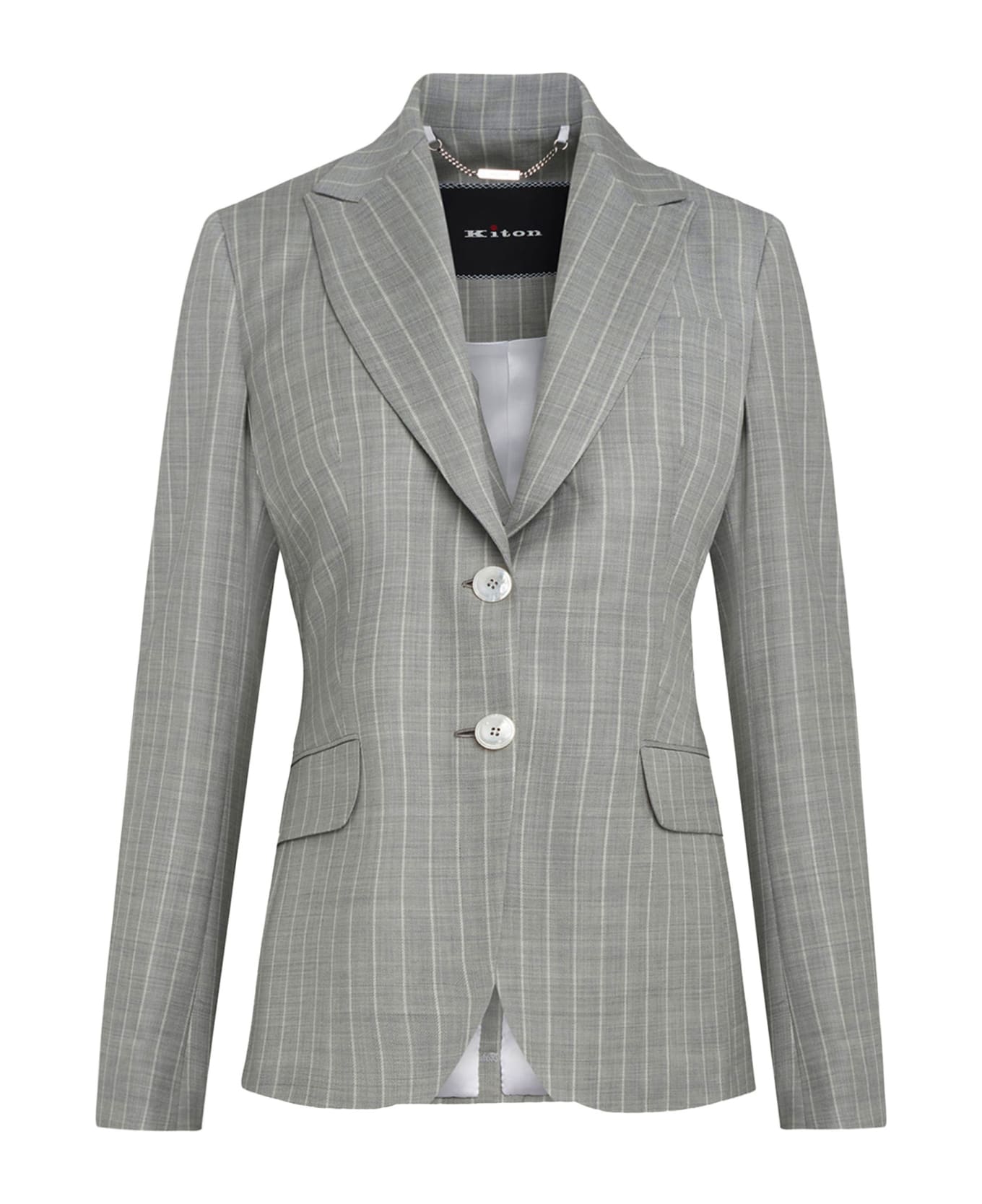 Riding jacket made from soft grey wool with a pinstripe pattern. The attention paid to fabric has always been a cornerstone of Kiton: in our wool mill in Biella, Italy, our constant experimentation has made it possible to create innovative textures and fibres, paying special attention to sustainability and the environment. . This jacket features pointed lapels, two horn buttons, and slightly inclined pockets with subtly rounded corners on the flaps. The garment is fully lined in pure silk satin. Every Kiton jacket is a masterpiece of design,entirely cut and sewn by hand in Naples by 25 master artisans who carry out 1,800 steps to complete such fine architectural attire. Perfect for formal occasions, this Kiton garment speaks to refined women with strong, passionate character, attentiveconnoisseurs of the sartorial traditions that it represents. It marks the return of the magic of an item of clothing that is worn for the delight of dressing to please yourself, as if it were a second skin. Self pampering in the name of tactile and visual indulgence. To maintain the beauty of your Kiton jacket, we recommend professional laundering and pressing.