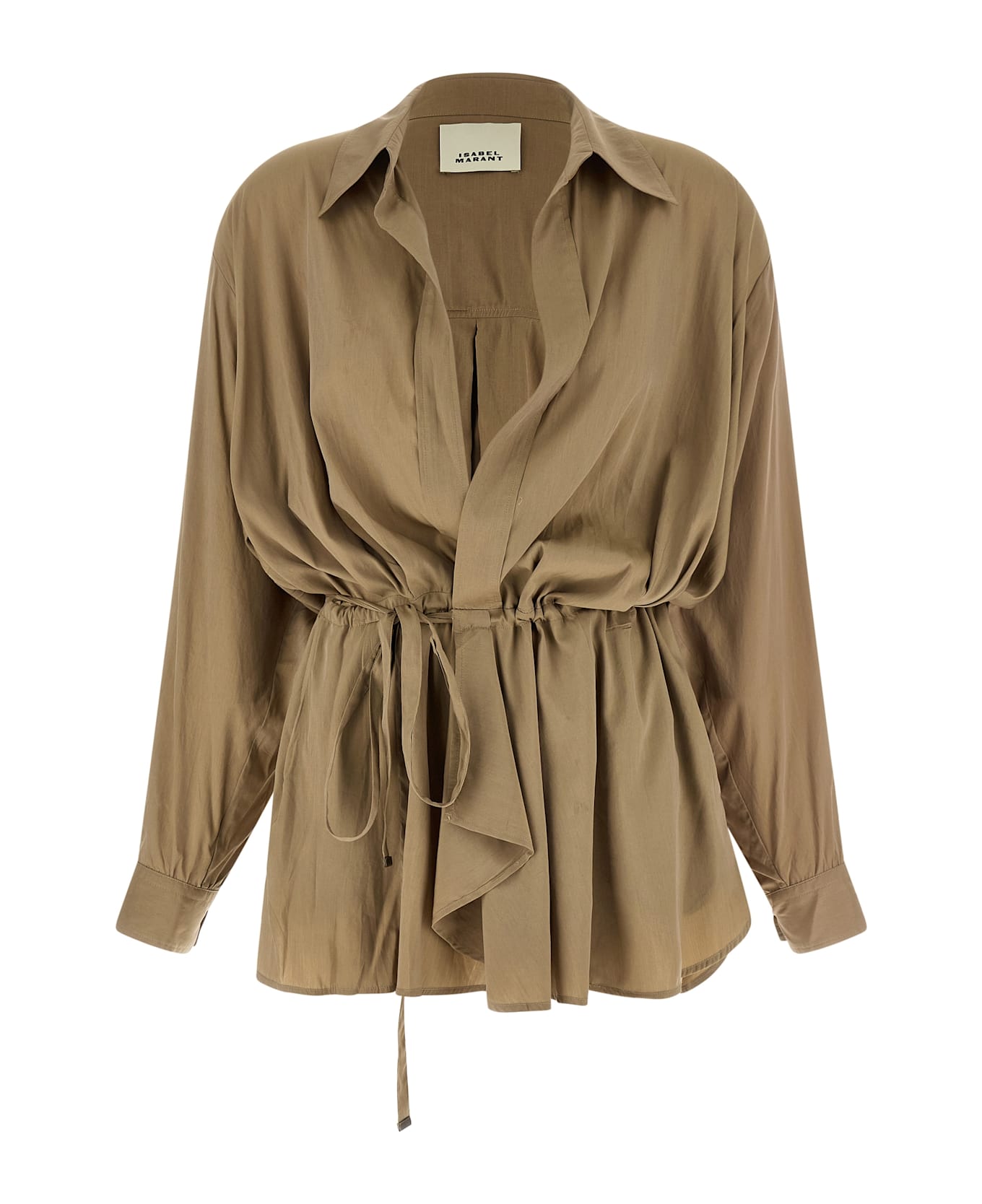 'Keren' blazer in satin technical fabric, wallet shirt model with front crossed laces, V-neck, long sleeves with cuffs and dropped shoulder, back elastic waistband. Composition: 75% modal 25% polyamide
