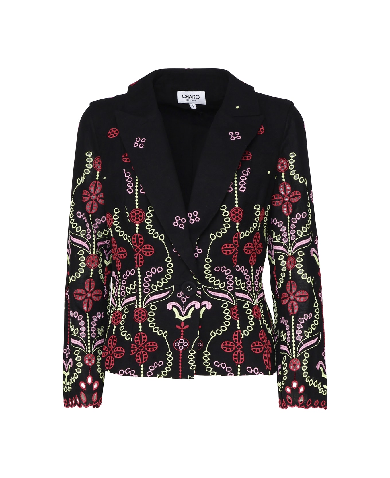 -Long sleeves with scalloped bottom -V-neck -Lapel collar -Button closure -All-over contrasting embroidery -Curved hem -Slim fit -Made in Portugal -Colour: Black, Pink, Red