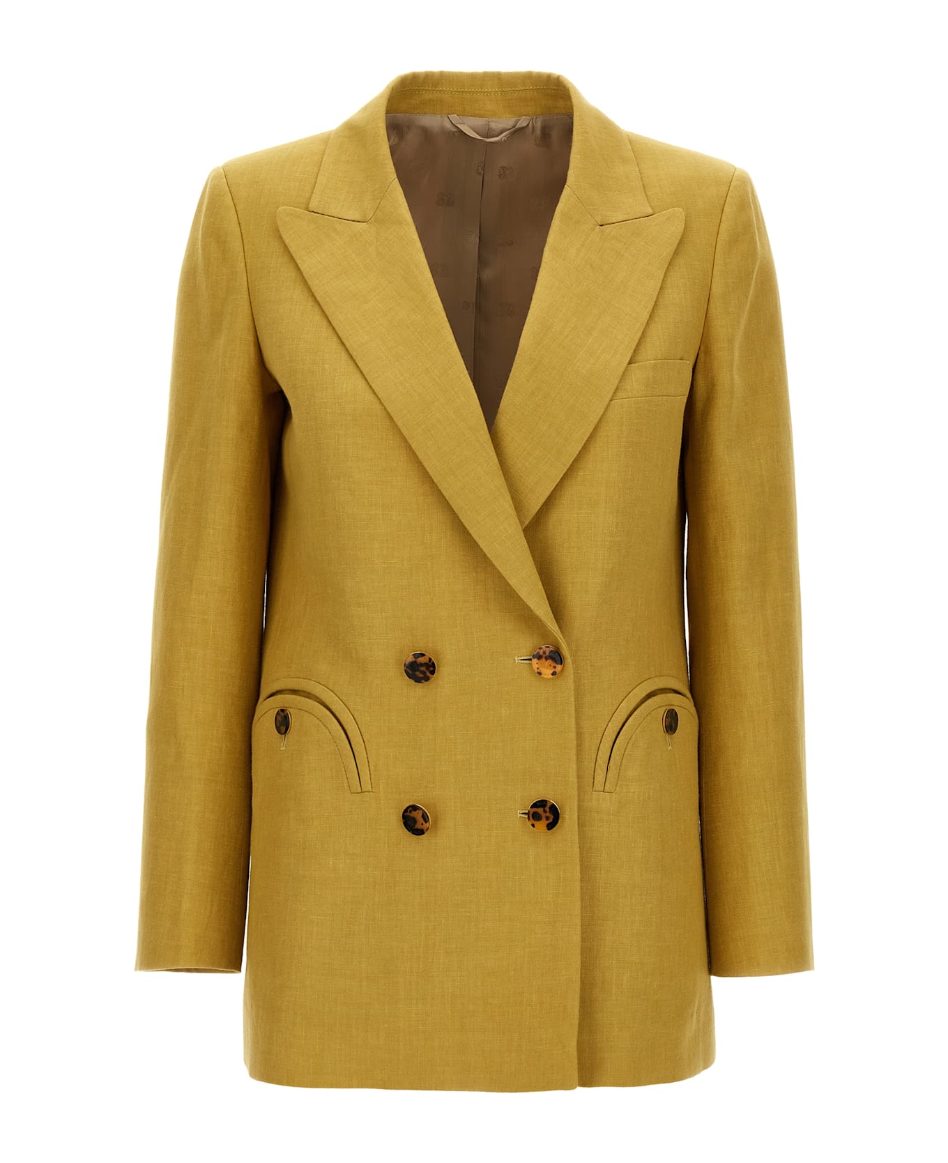 'Midday Sun Everyday' double-breasted linen blazer with button closure, peak lapels, padded shoulders, pockets, viscose lining, back split. Composition: 100% linen