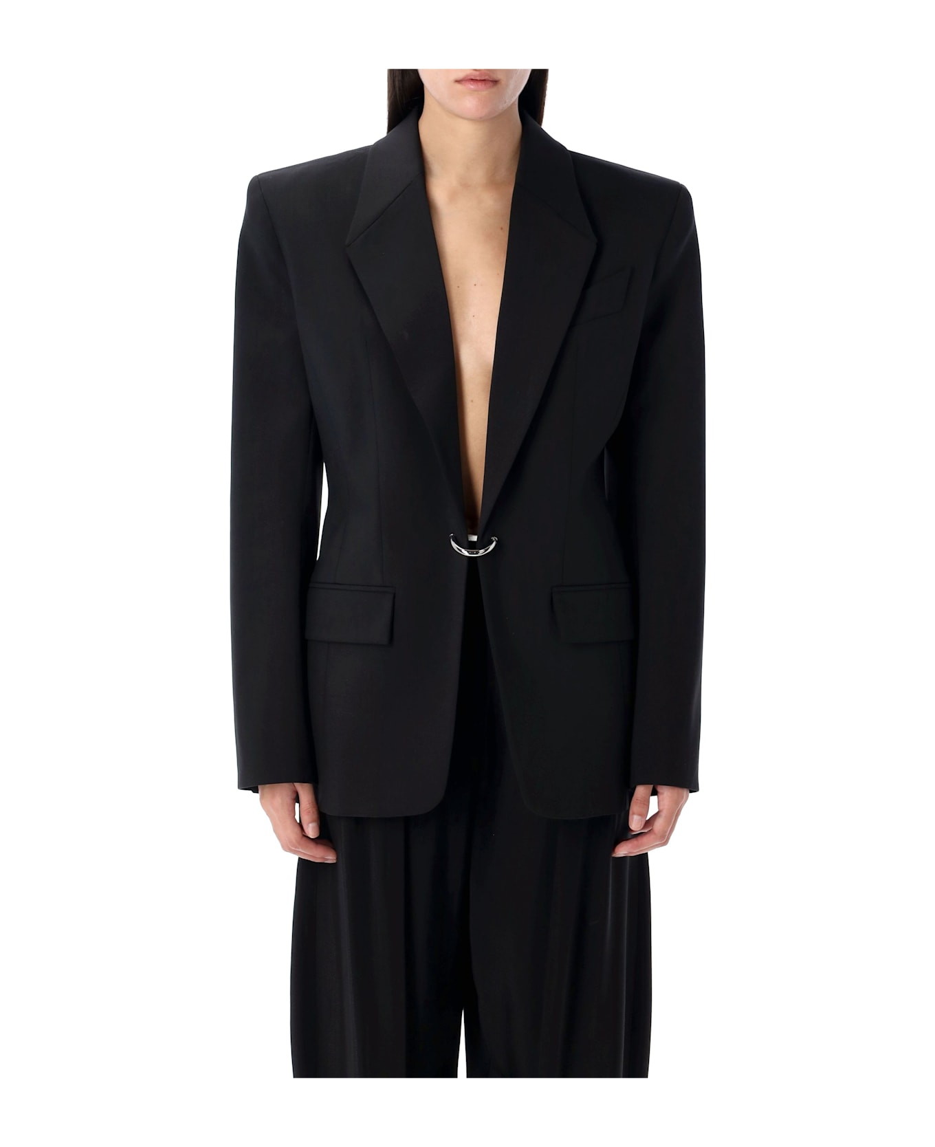 Wool Pierced Tailored Jacket By Mugler. Featuring: Shawl Collar Silver Piercing Buckle Shoulder Pads Chest Pocket Front Flap Pockets Model Is 1,70 M And Wears Size 38