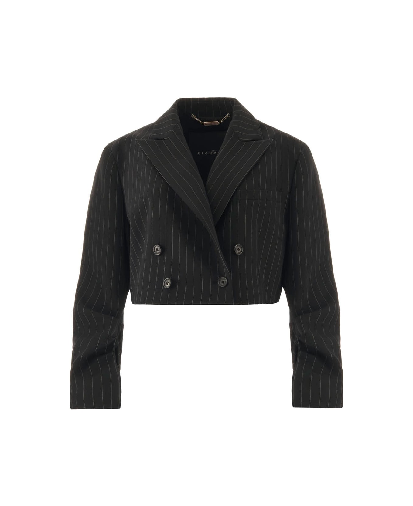 Pinstriped cropped blazer. Double-breasted coat with classic lapels.