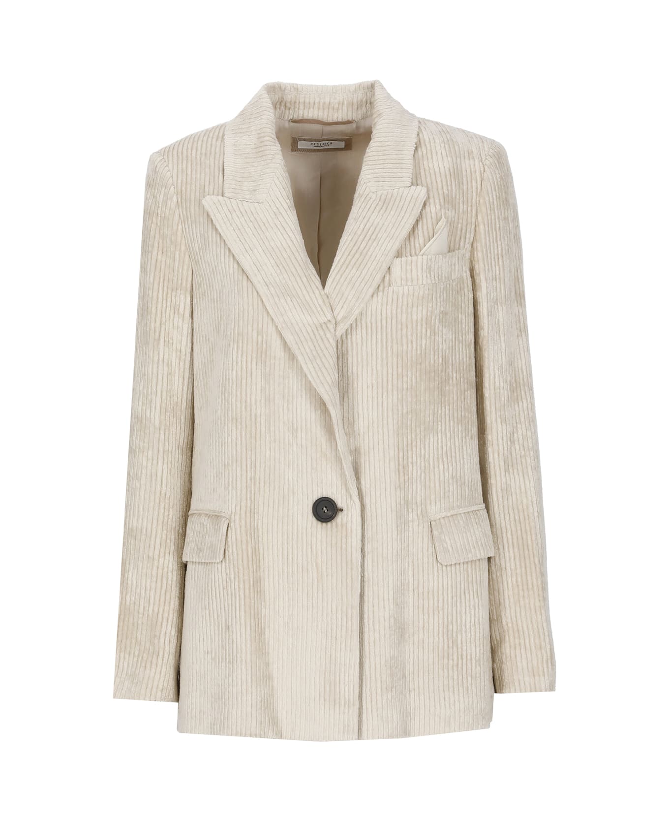 - Beige Peserico jacket for woman - Peak lapel collar - Long sleeves - Two front flap pockets - One breastpocket with pochette - All-over ribs - One rear vent at hem Composition: 100% Cotton Lining:, 67% Cotton, 33% Silk