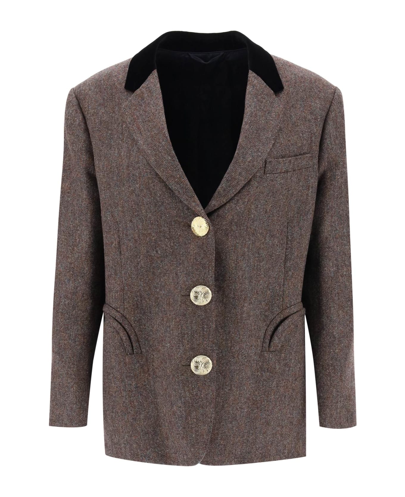 Blazé Milano blazer crafted in pure virgin wool panama with single-breasted design and closure with gold-tone metal jewel buttons. It features notched lapel with contrasting velour inlay, a chest welt pocket and Smiley pockets with concealed button. Lined interior provided with a pocket. Oversized fit with straight cut enhanced by padded shoulders. The model is 177 cm tall and wears size 0 Blazè Milano.