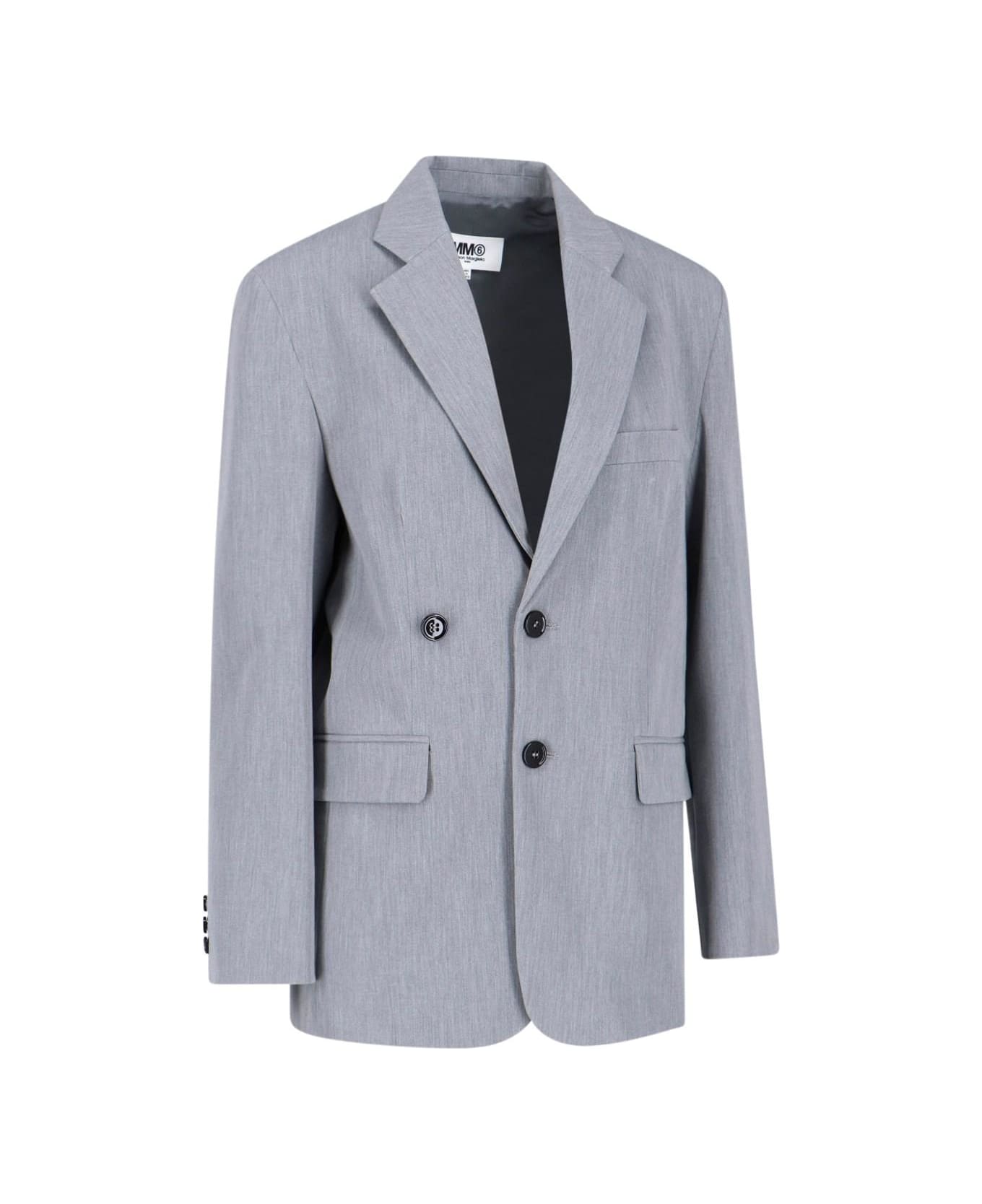 Maison margiela MM6 single breast blazer jacket in gray fabric with classic lapels, chest pocket, a button closure, two front flap pockets, cuffed buttons, a central back split and a straight hem.