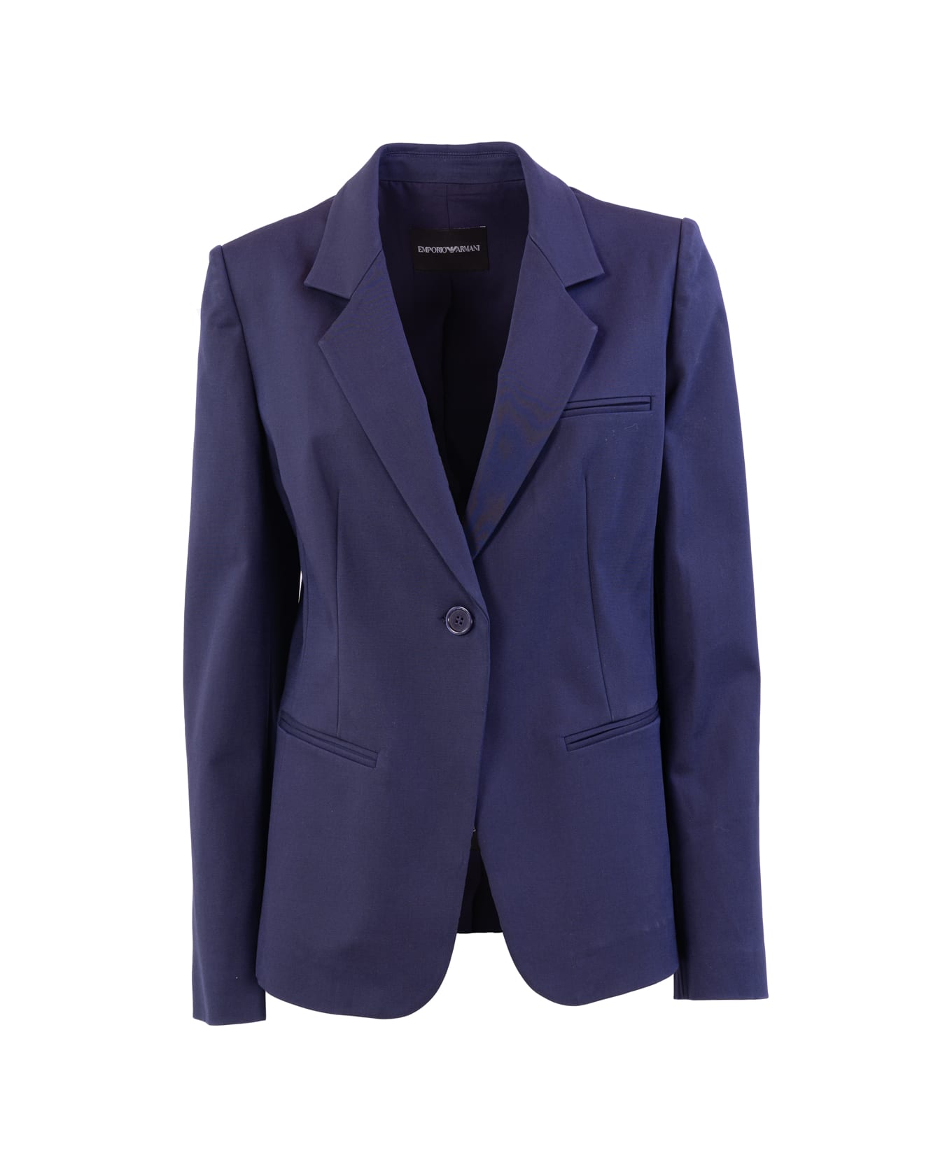 Emporio Armani single-breasted jacket in jersey. Solid colour. Collar with lapels. Single breasted. Long sleeves. Two pockets. Front closure. Composition: 56% Cotton 40% Viscose 4% Elastane. Made in China.