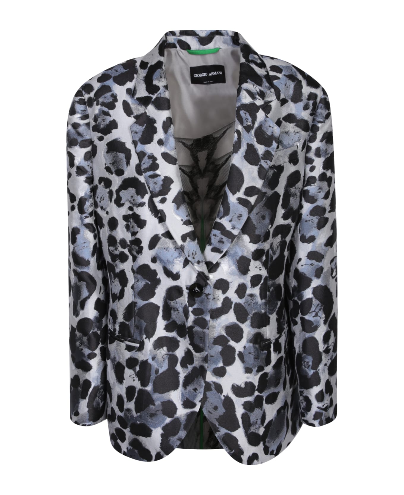 Classic lapels. Long sleeves. Front button fastening. All-over leopard print. Chest welt pocket. Two front welt pockets. Color: blue