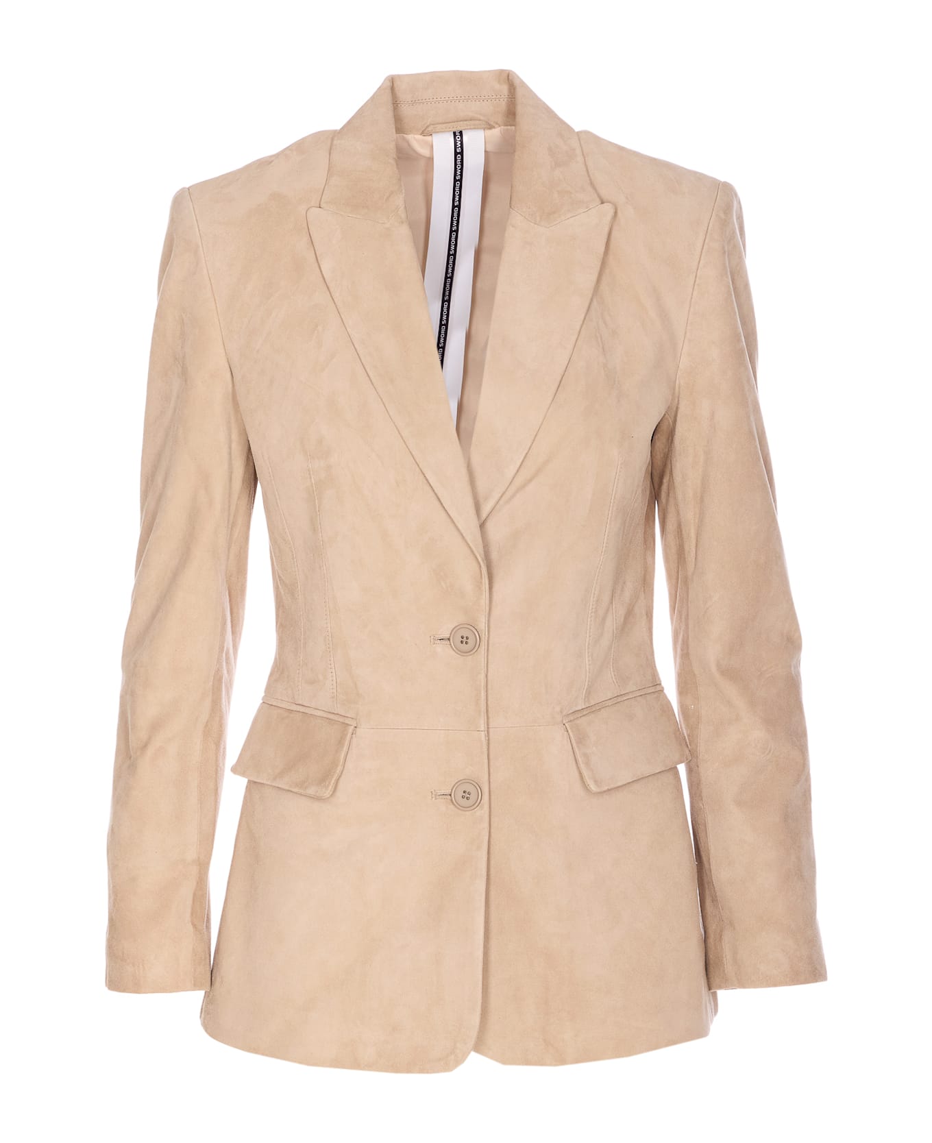 Sword beige suede jacket with buttons closure, V-neck, reinforced shoulder, long sleeves, buttons on cuffs