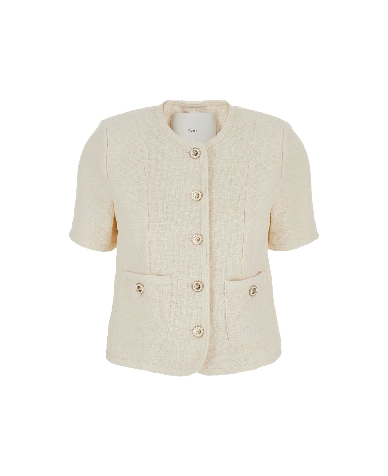 Jacket Beige Collarlessl Short sleeves Front button closure Jewel buttons Two front patch pockets with button Straight hem Wool blend Regular fit