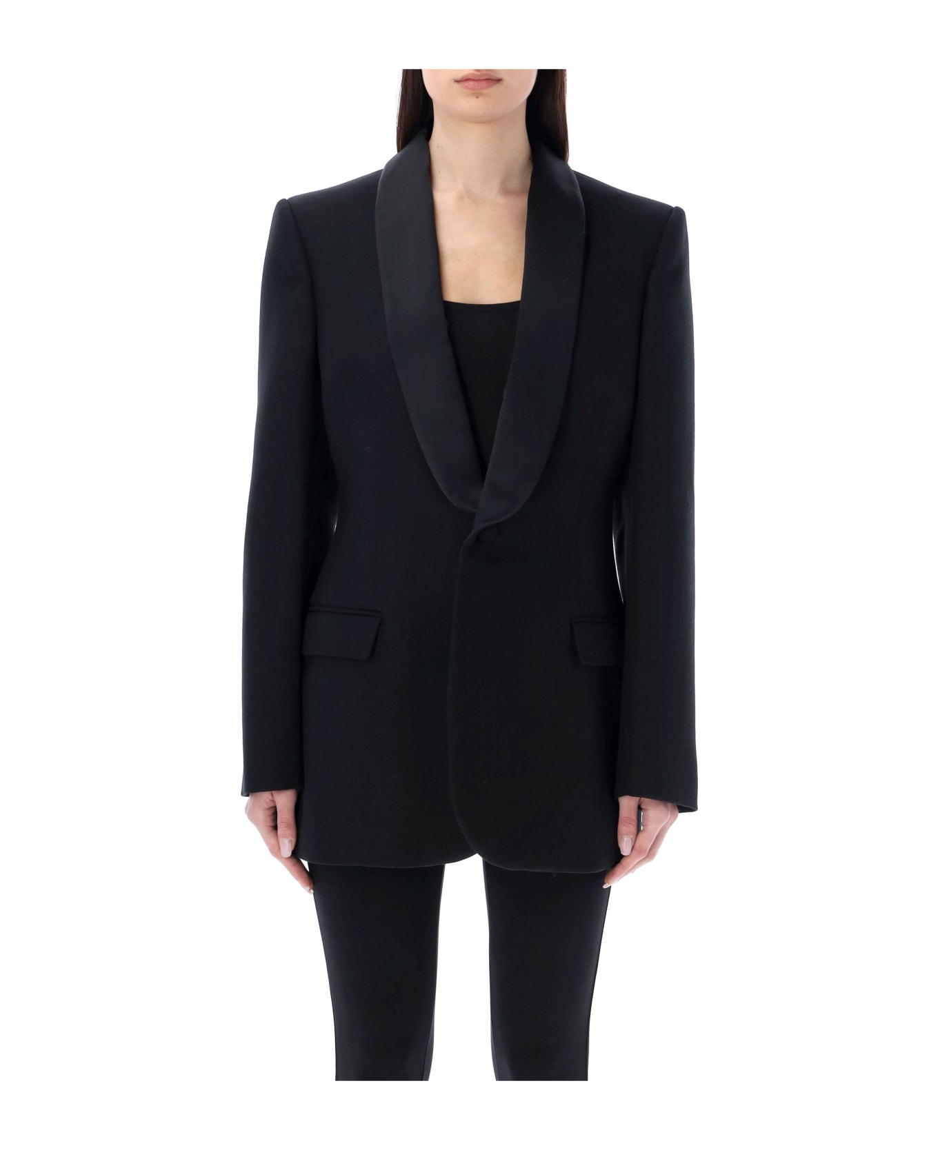 Wool Tuxedo Blazer By Wardrobe Nyc. Featuring: Shawl Collar Crafted In A Rich Merino Wool With Silk Satin Collar Single-breast Button Defined Shoulder Long Sleeves Buttoned Cuffs Flap Pockets Lined Model Is 1,72 M Tall And She Is Wearing Size S