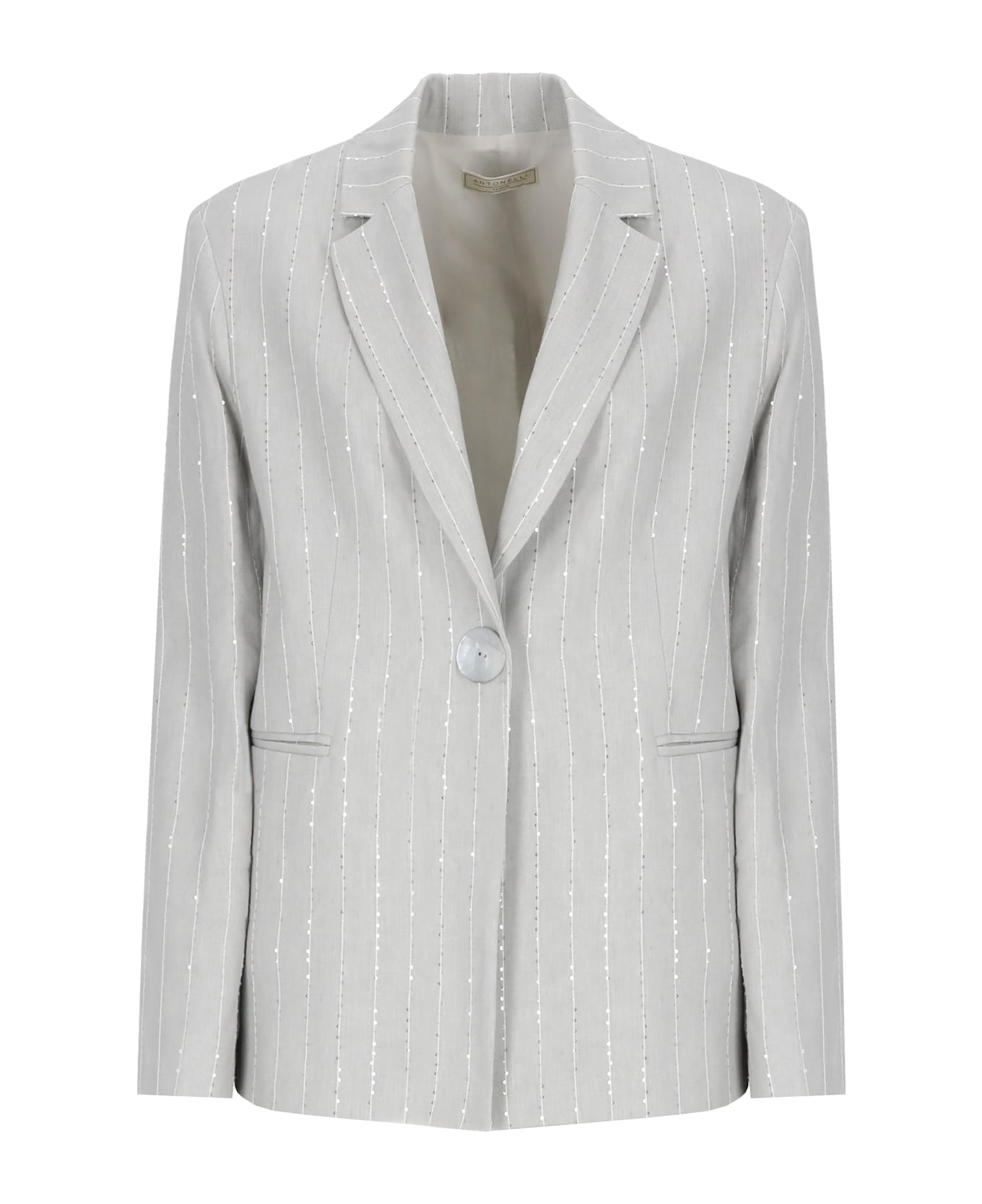 - Grey Antonelli Firenze linen and viscose jacket - Peak lapel collar - Fastening with button - Two side pockets - All-over pinstriped pattern with paillettes details
