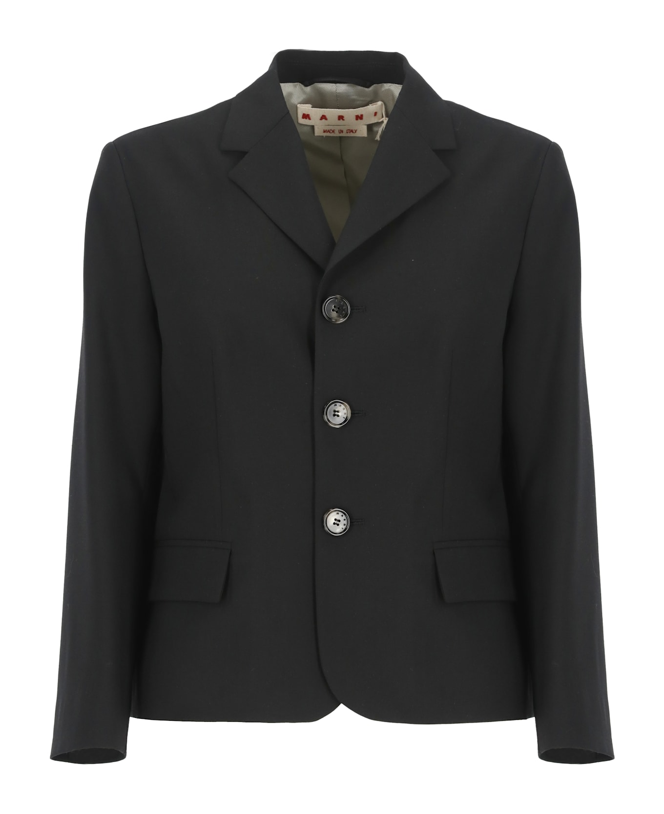 - Black Marni virgin wool blend blazer for woman - Long sleeves - Classic lapel collar - Front buttons fastening - Two front flap pockets - One rear vent at hem Composition: 53% Polyester, 43% Virgin Wool, 4% Elastane Lining:, 100% Viscose Sleeve Lining:, 100% Cupro