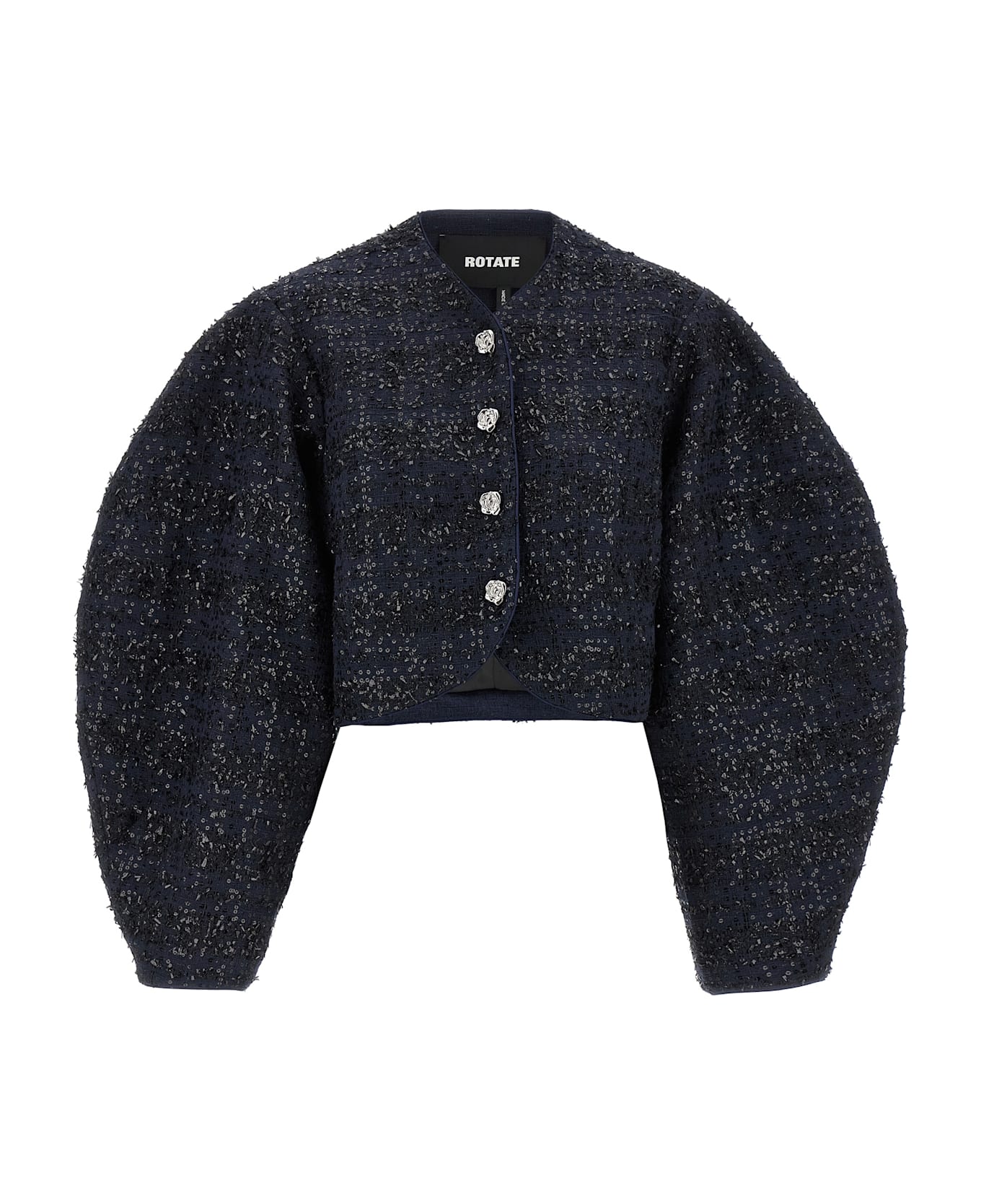 'Bouclé Short' bouclé fabric blazer with all-over sequin appliqué, bolero crop model, front button closure, crew neck, wide long sleeves. SUSTAINABLE: Product made from recycled polyester.