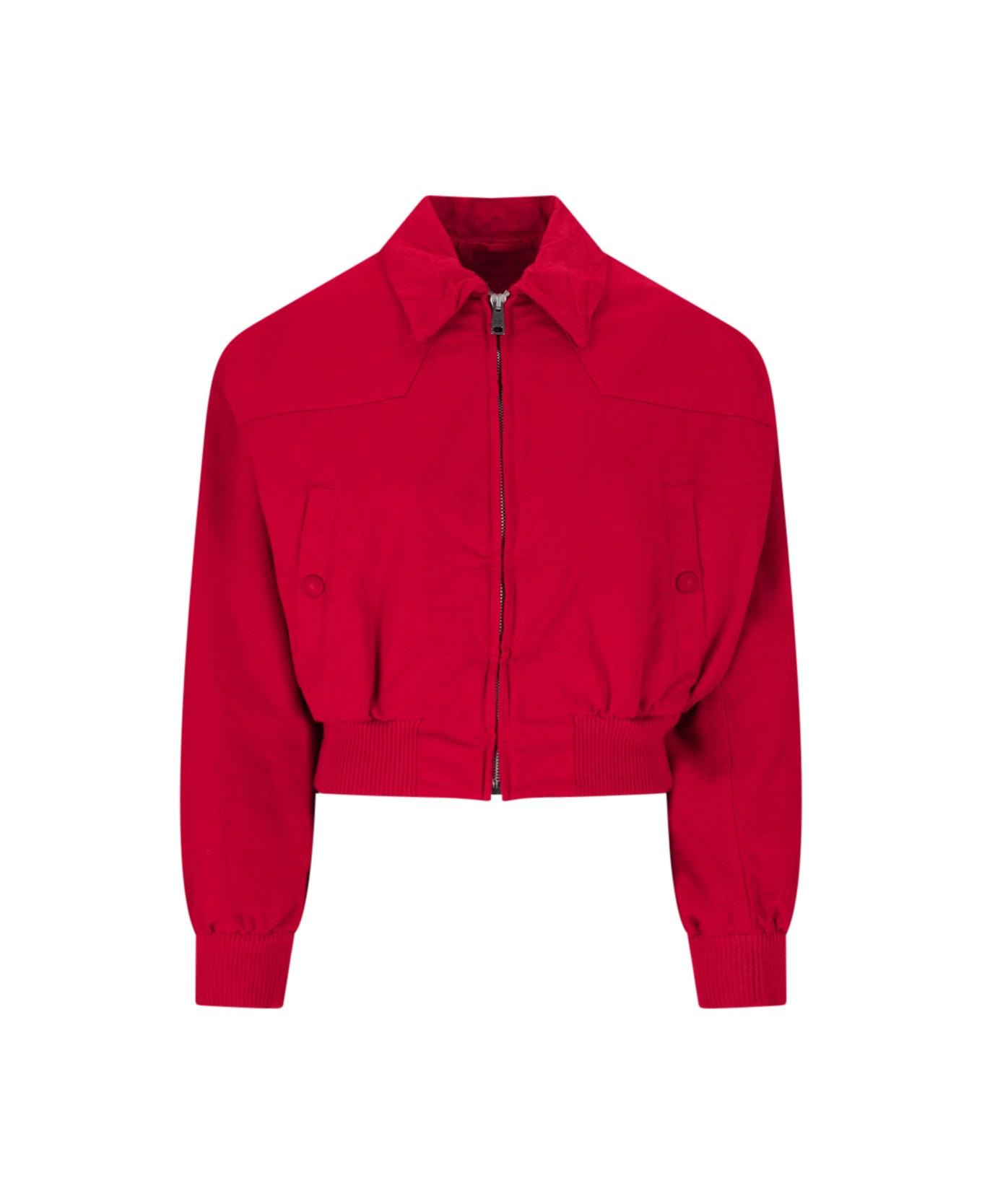 Prada canvas jacket, in red cotton, classic collar, zip fastening, two side button pockets, triangle logo cut-out back, ribbed trim, straight hem. Composition: 100% Cotton