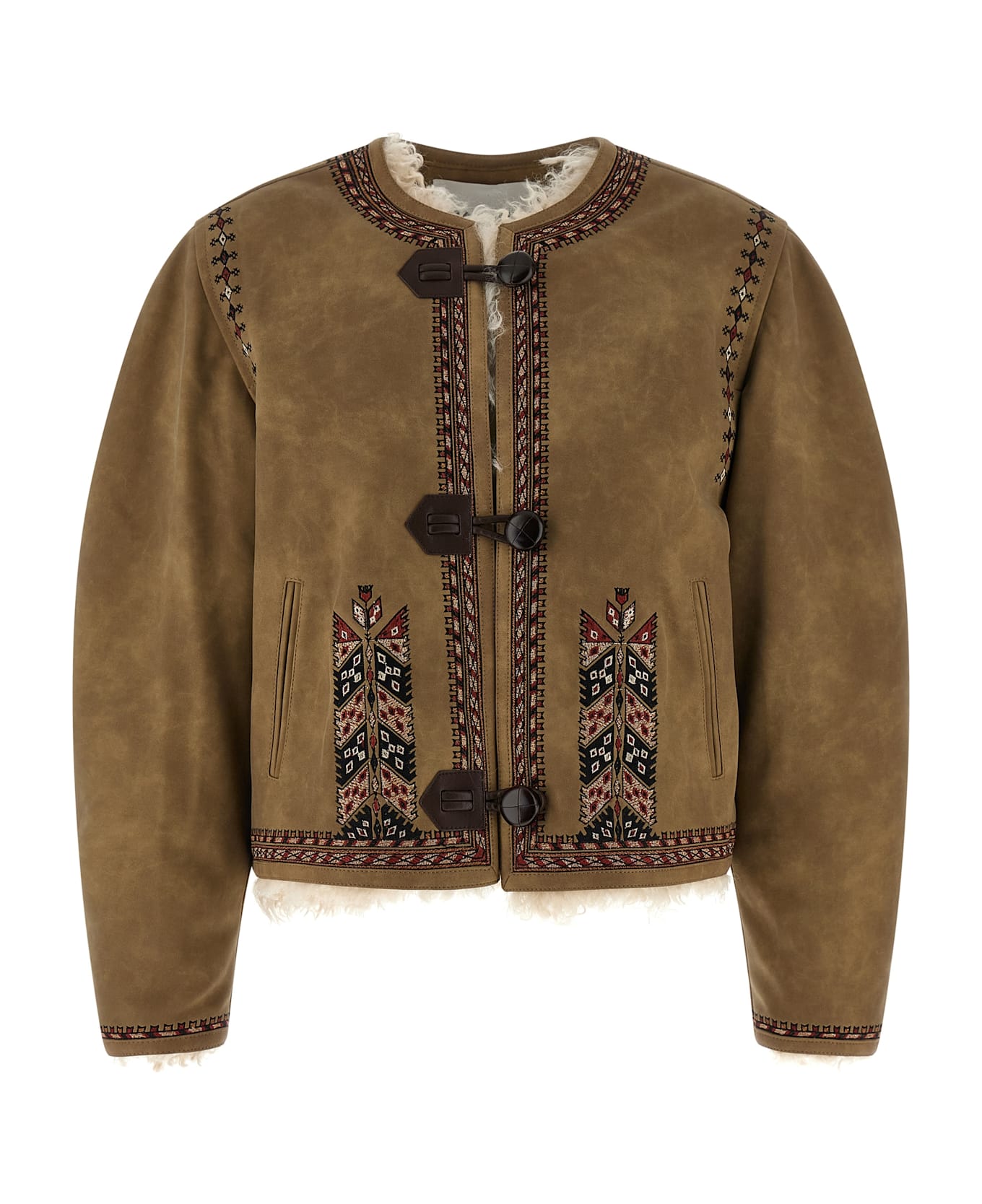 'Cely' double-sided suede effect fabric jacket with embroideries on the front and back, shearling-effect fabric lining, slightly crop model, crew neck, front toggle closure, pockets, long sleeves.