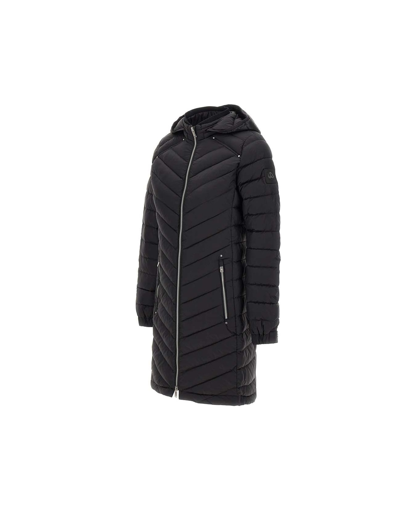 Women s Moose Knuckles "Air Down" parka, black, removable hood with zip, front fastening with double-slider silver zip, adjustable cuffs with buttons, two side pockets with zip, iconic logo patch on left sleeve, slim fit, lightweight padding ideal high and low season.