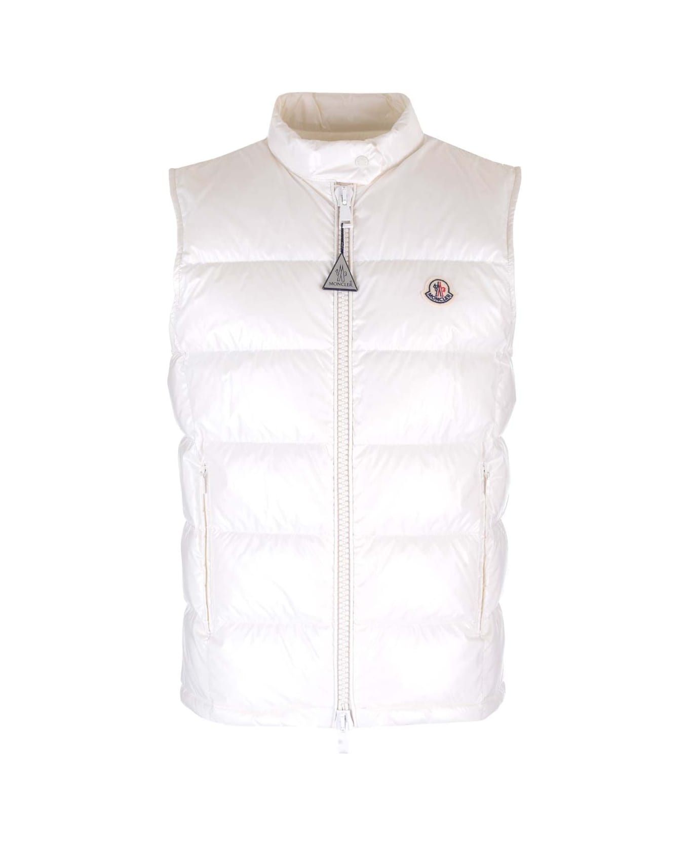 White nylon "Alcibia" vest with zip closure, snap collar, zip pockets.