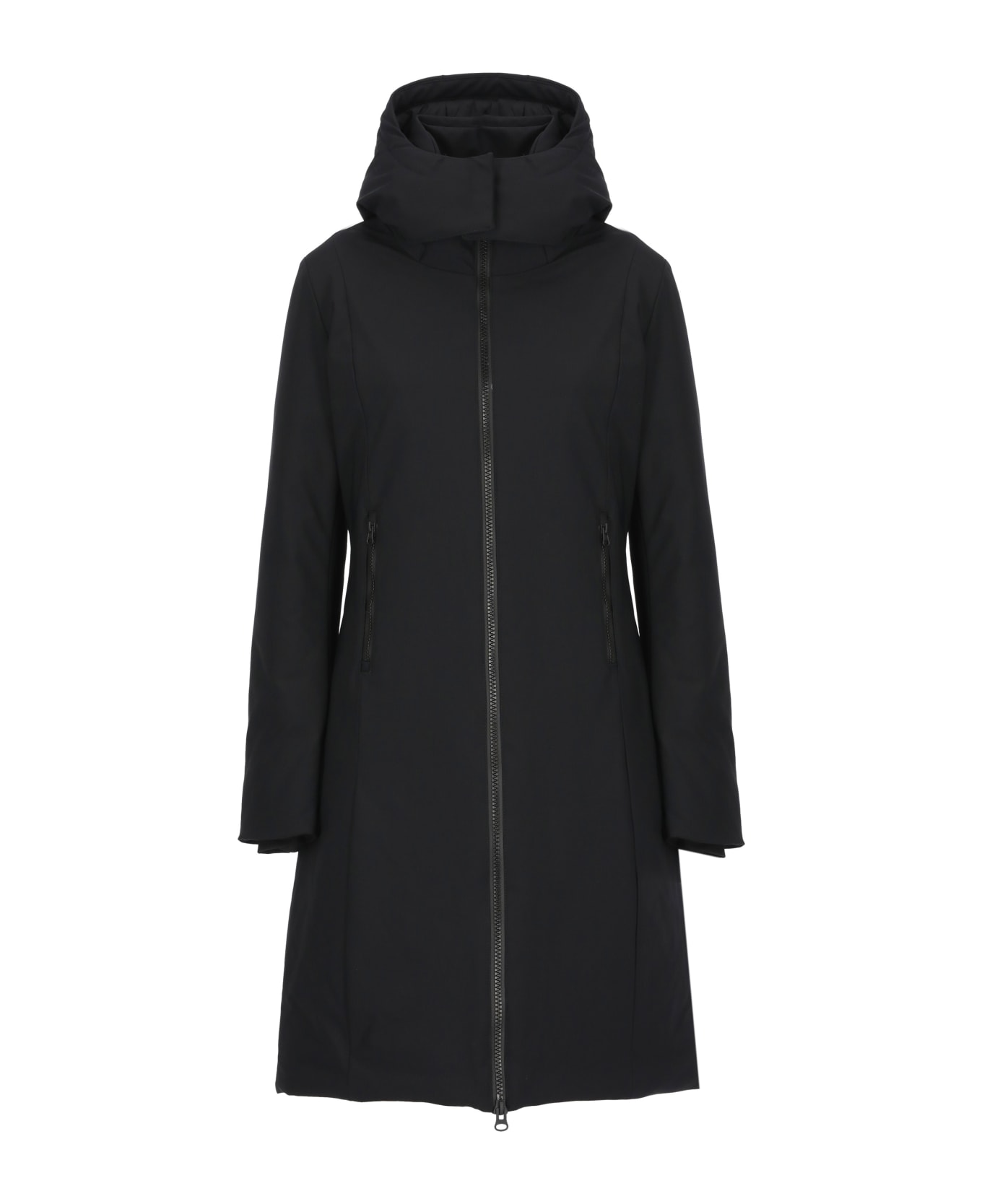 - Black Save The Duck padded coat for woman - High neck - Removable hood with drawstrings - Long sleeves - Tone on tone embroidered logo at left sleeve - Front double-slider zip fastening - Two front zip pockets