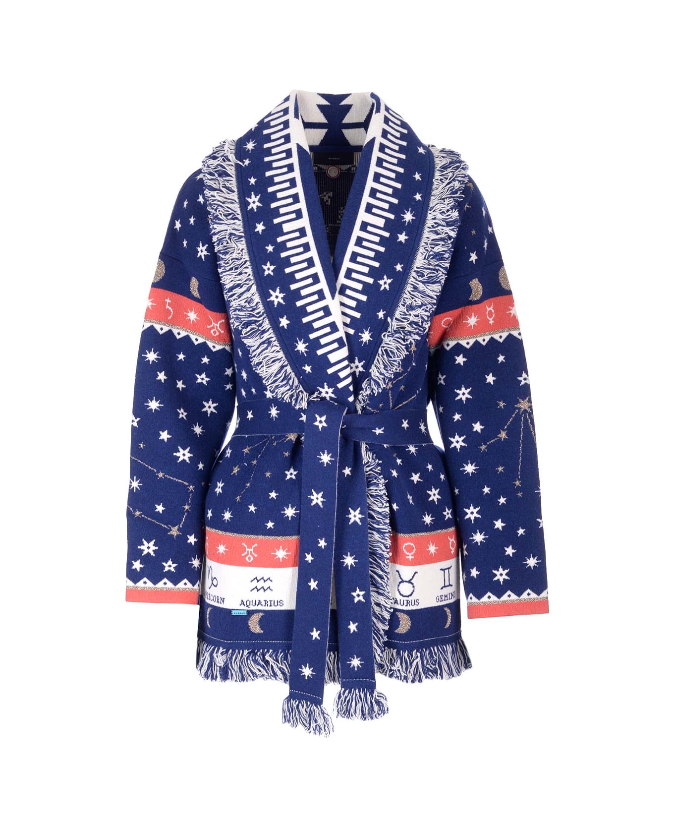 Alanui 'Astrology Wheel' cardigan in wool blend with matching self-tie belt and fringed profile Composition: FABRIC 22% CASHEMERE 4% POLYESTER 60% WOOL 7% POLYAMIDE (NYLON) 7% VISCOSE