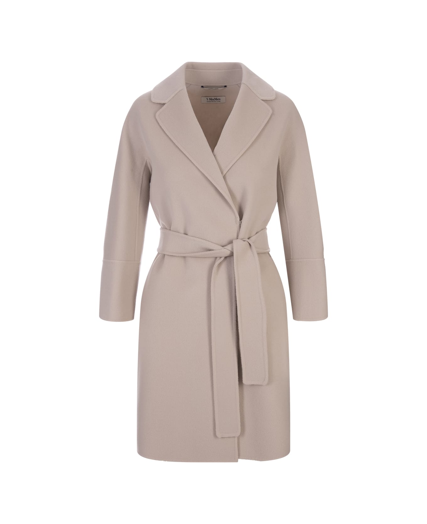Beige Arona short coat by 'S Max Mara made of fine hand-sewn pure double wool fabric, characterised by a wide line slightly closed at the bottom. Unlined model completed with a small lapel collar, pockets inserted in the hips, kimono sleeves on the front and raglan on the back. The matching belt at the waist emphasises the silhouette.