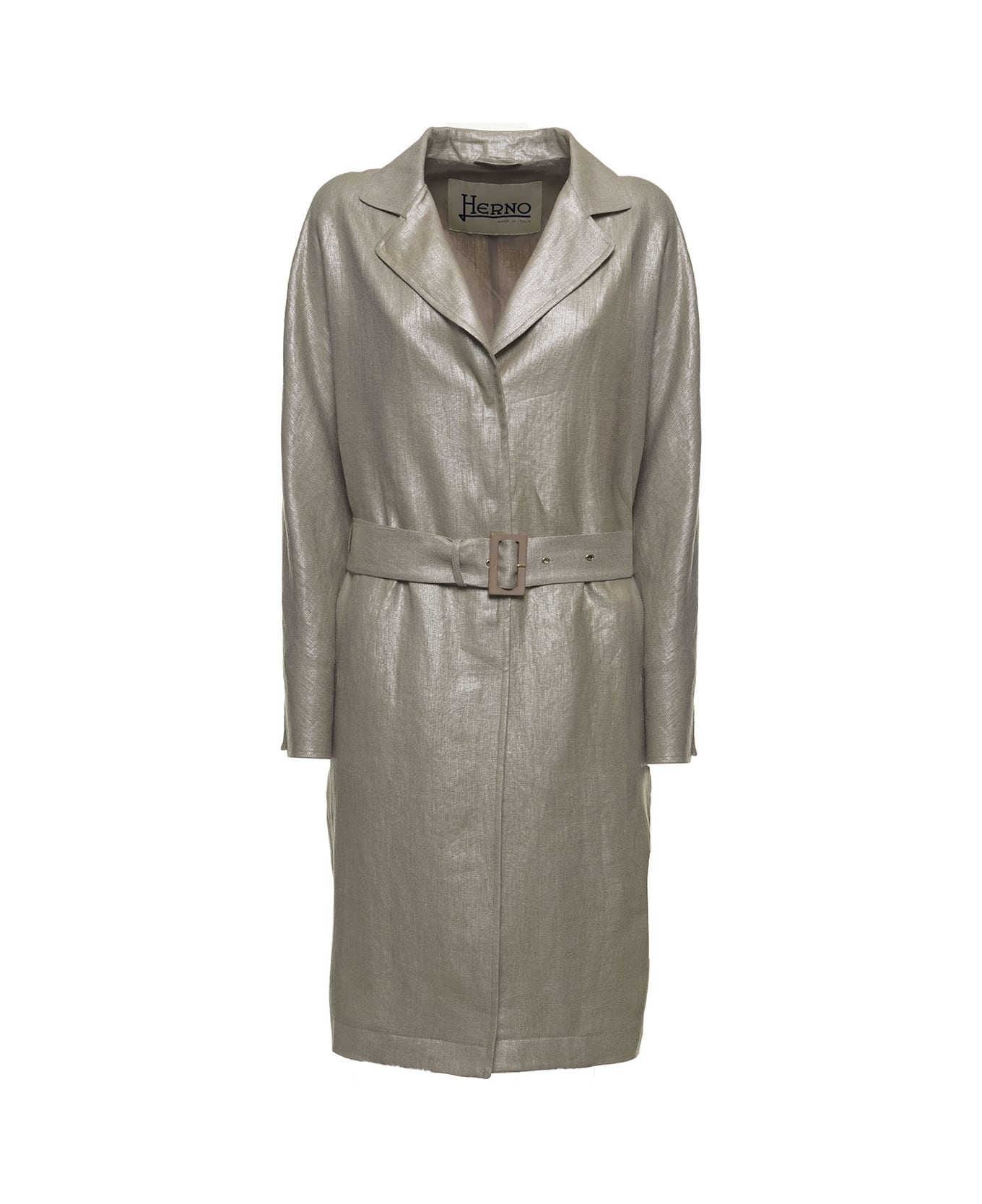 Coat Peaked lapels Beige Linen Waist belt with buckle Belt loops Long sleeves Composition: 100% Linen