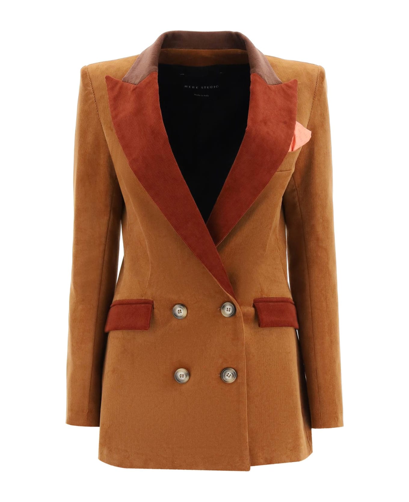 Double-breasted blazer by Hebe Studio made of stretch cotton corduroy finished with contrast details. Waisted silhouette featuring four-button fastening, peak lapels, welt pockets and a chest pocket provided with pocket square. Fully lined with an internal pocket, logo-engraved gold-tone button detail on the left cuff. Slim fit. The model is 177 cm tall and wears a size IT 40.