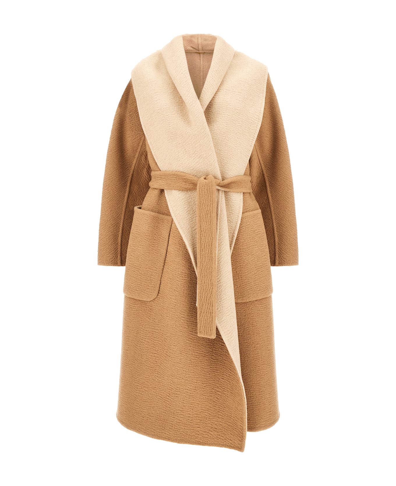 Reversible coat realized in pure camel wool characterized by peculiar neckline. -Belt closure -Raglan sleeves -Two patch pockets at the front -Lateral alit on the hemline