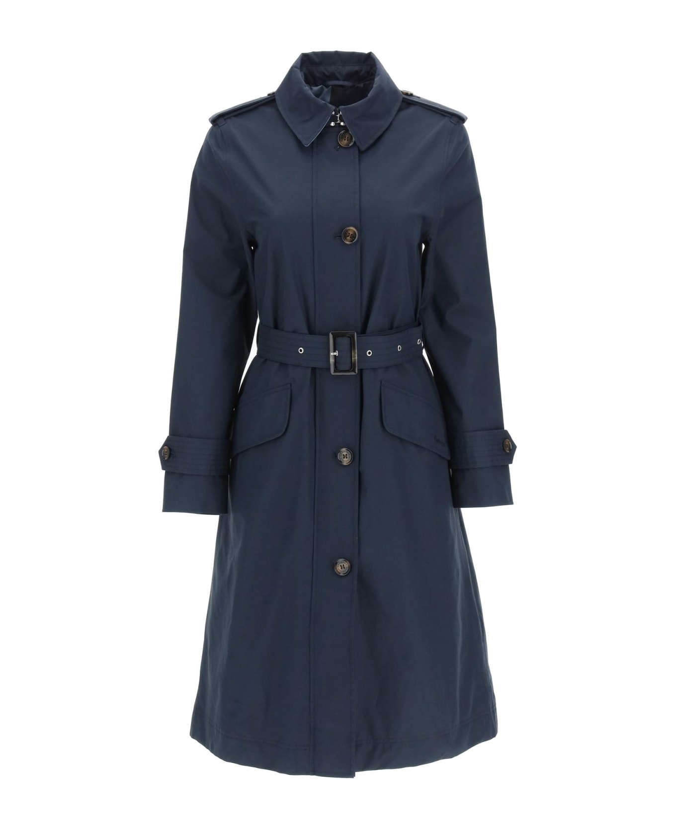 Long trench coat in waterproof and breathable technical cotton gabardine by Barbour. It features a regular fit with straight cut and a single-breasted design with shirt collar, double fastening with two-way zip and buttons, hook-and-eye collar fastening, adjustable cuffs with button tab, epaulettes. At back, it showcases button-through storm flap and central vent with hidden snaps. Flap pockets with embroidered logo detail. Tartan lining, one inside pocket, self-fabric belt. The model is 177 cm tall and wears a size UK 8.