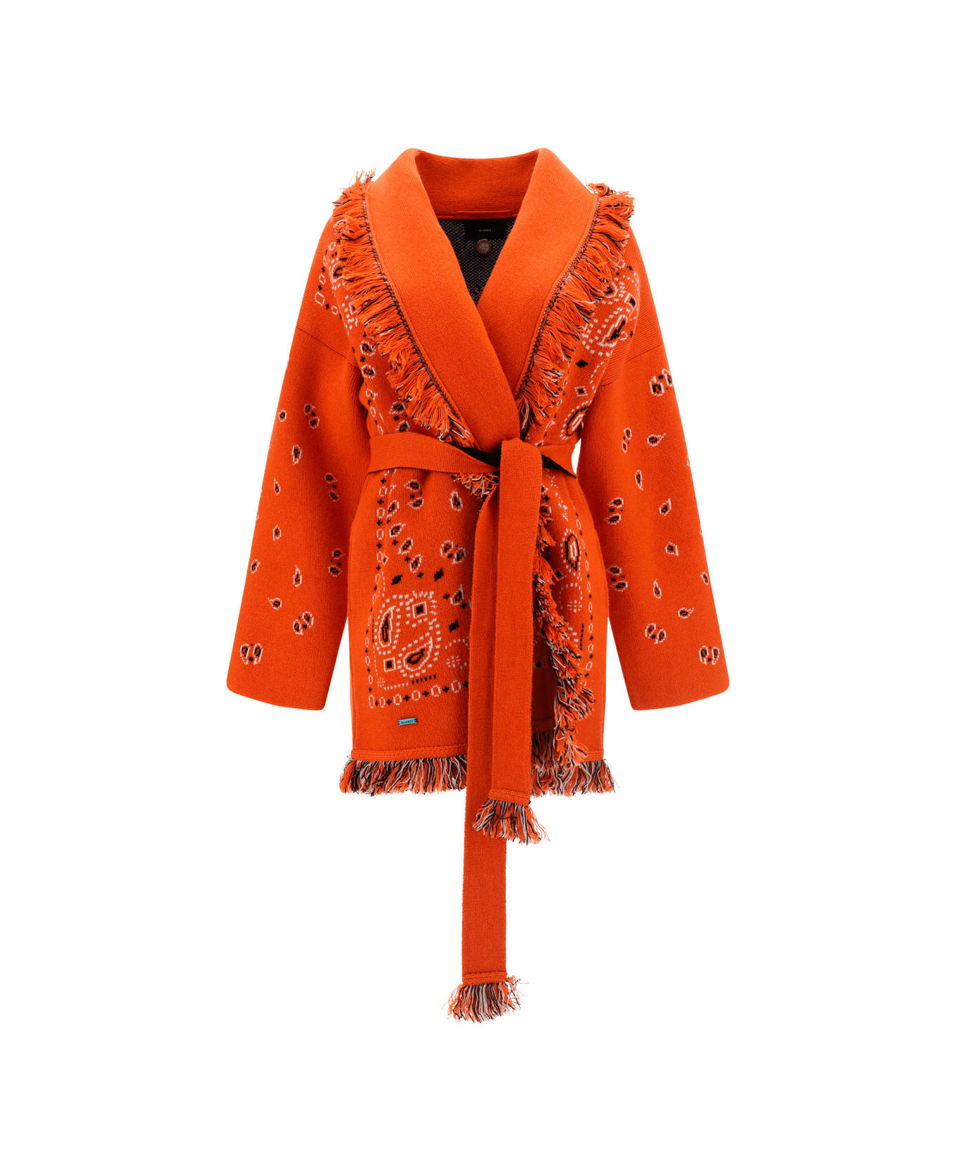 Cashmere cardigan by alanui, v-neck, all-over jaquard bandana pattern, shawl lapels, oversize fit, front fastening with matching sash, two side bellows pockets, frayed edges and hems. Composition: 100% % Kashmir/capra Hircus