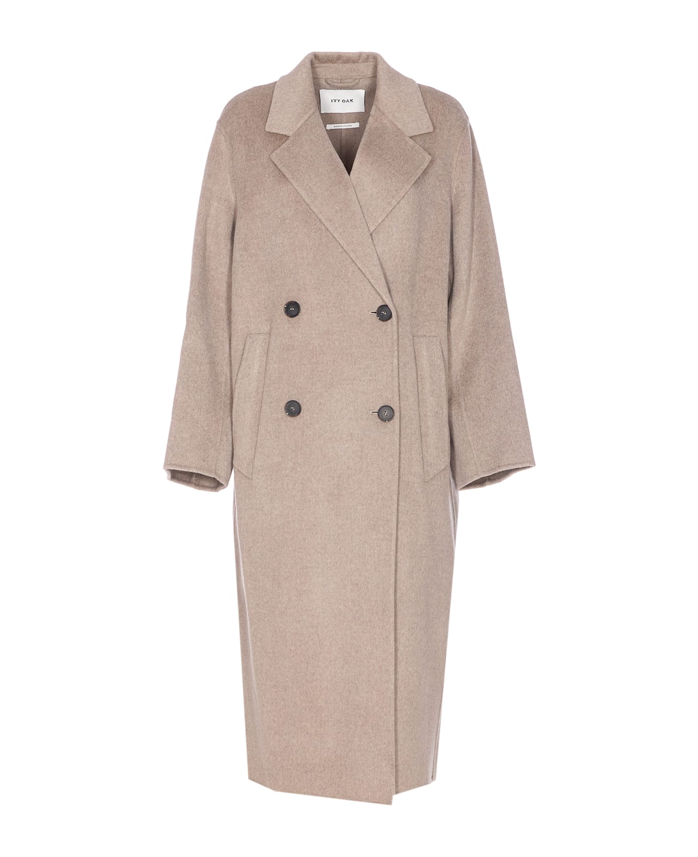 Ivy & Oak beige Clara coat with frontal double breasted buttons closure, V-neck, long sleeves, striped, split on the back