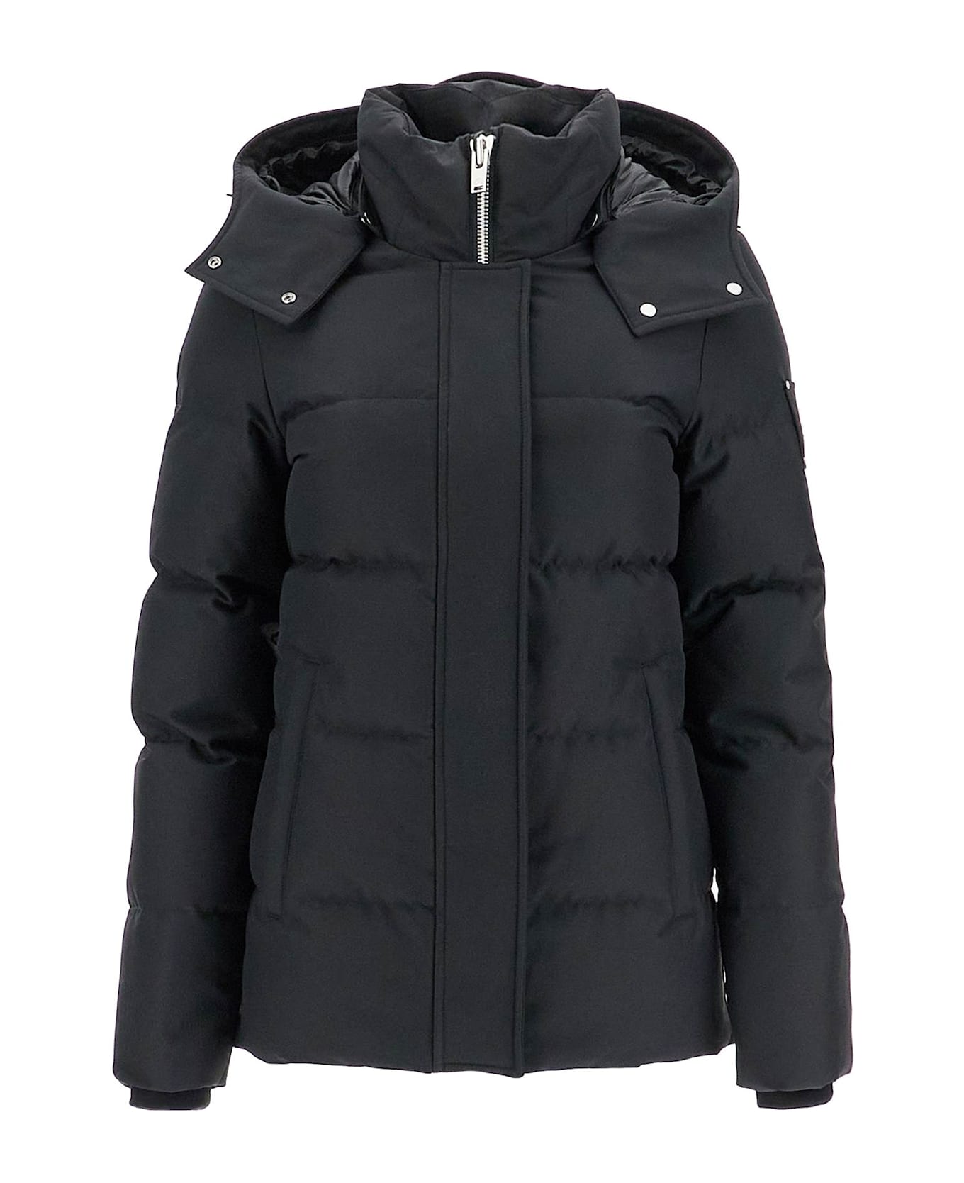 Short Moose Knuckles down jacket made of matte nylon with water-repellent and windproof properties, featuring horizontal quilting and warm 90/10 duck down and feather padding. It has a high collar with an adjustable and removable hood lined in tone-on-tone Shearling fur, a hidden two-way zip closure with snap buttons, and oblique pockets with concealed zips. The slim fit can be adjusted at the bottom with side zips and is finished with a logo patch on the sleeve
