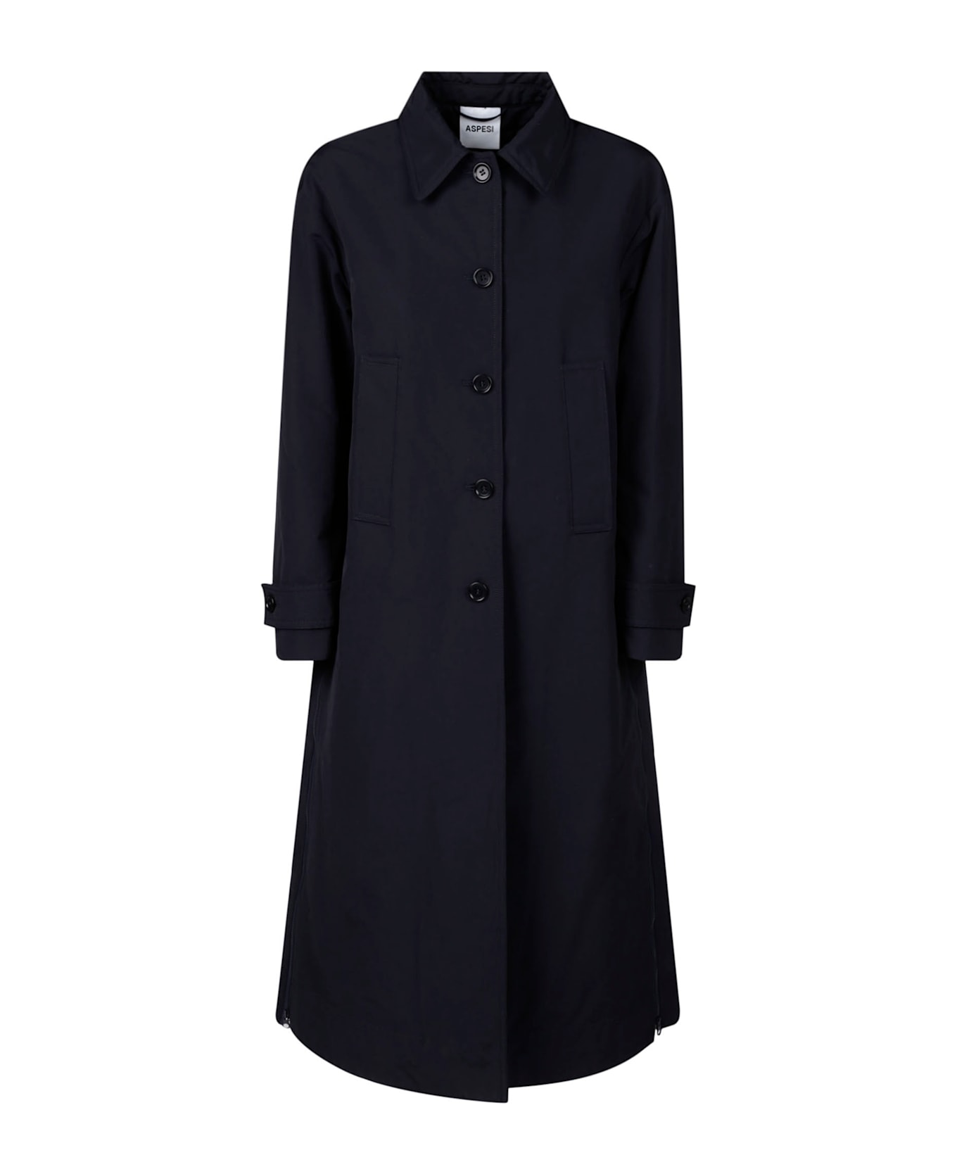 ASPESI COAT , Crafted from a premium navy blue fabric, this coat has a classic, sophisticated design that`s perfect for cooler days. The fit is comfortable and well-structured, offering a refined look thanks to tailored details, such as side pockets and meticulous finishes. The navy blue color is versatile and easy to match with various outfits, making it suitable for both formal occasions and more casual looks.