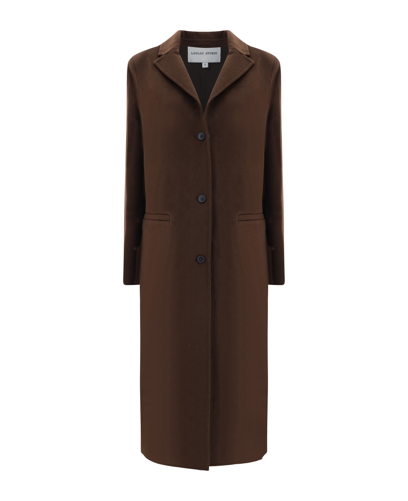 Wool coat by loulou studio, classic lapels, front button closure, two front patch slit pockets, monochrome design, foot-length style, regular fit.
