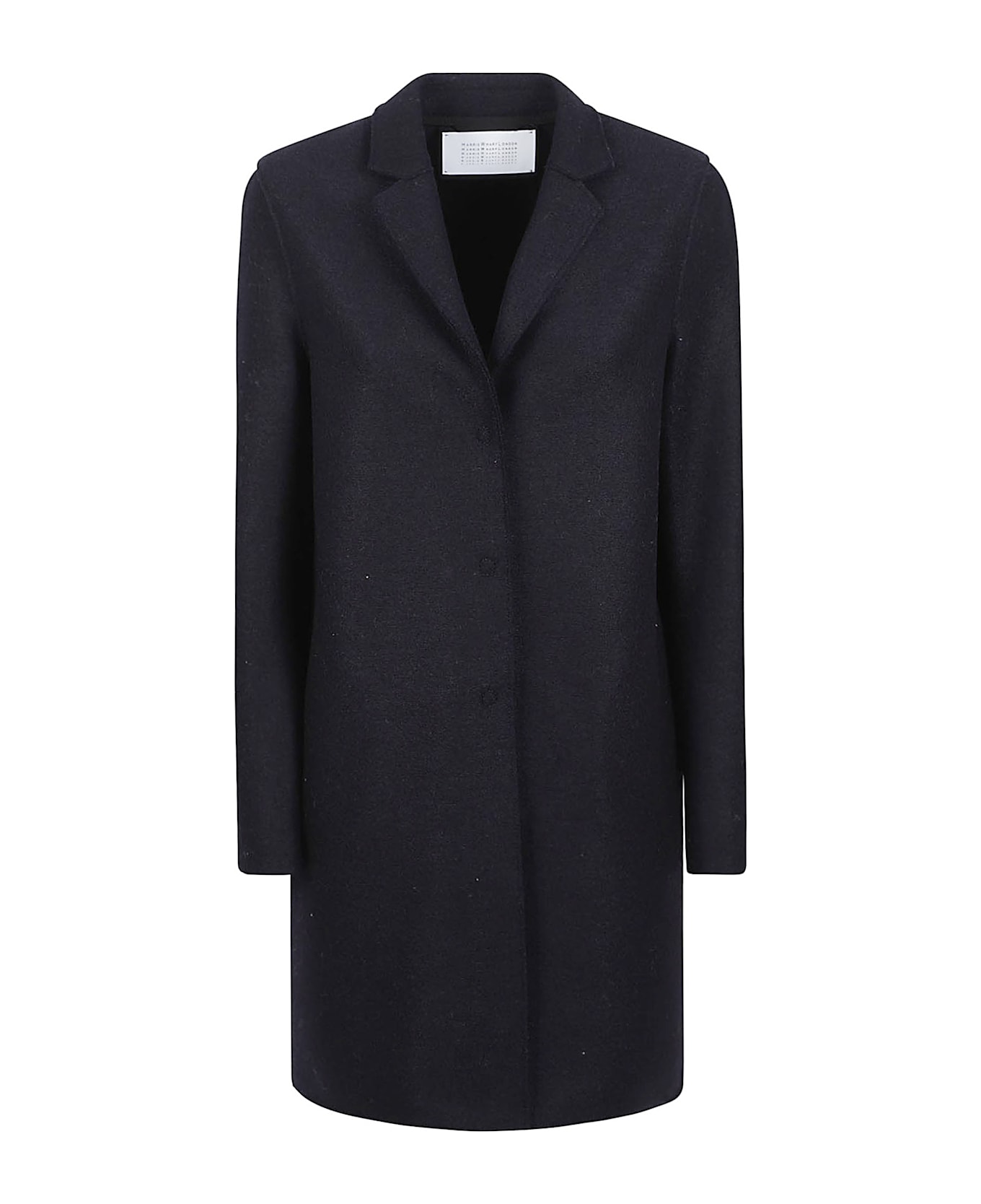 Single-breasted virgin wool coat Collar with lapels Knee length Two side welt pockets Button closure Colour: midnight blue