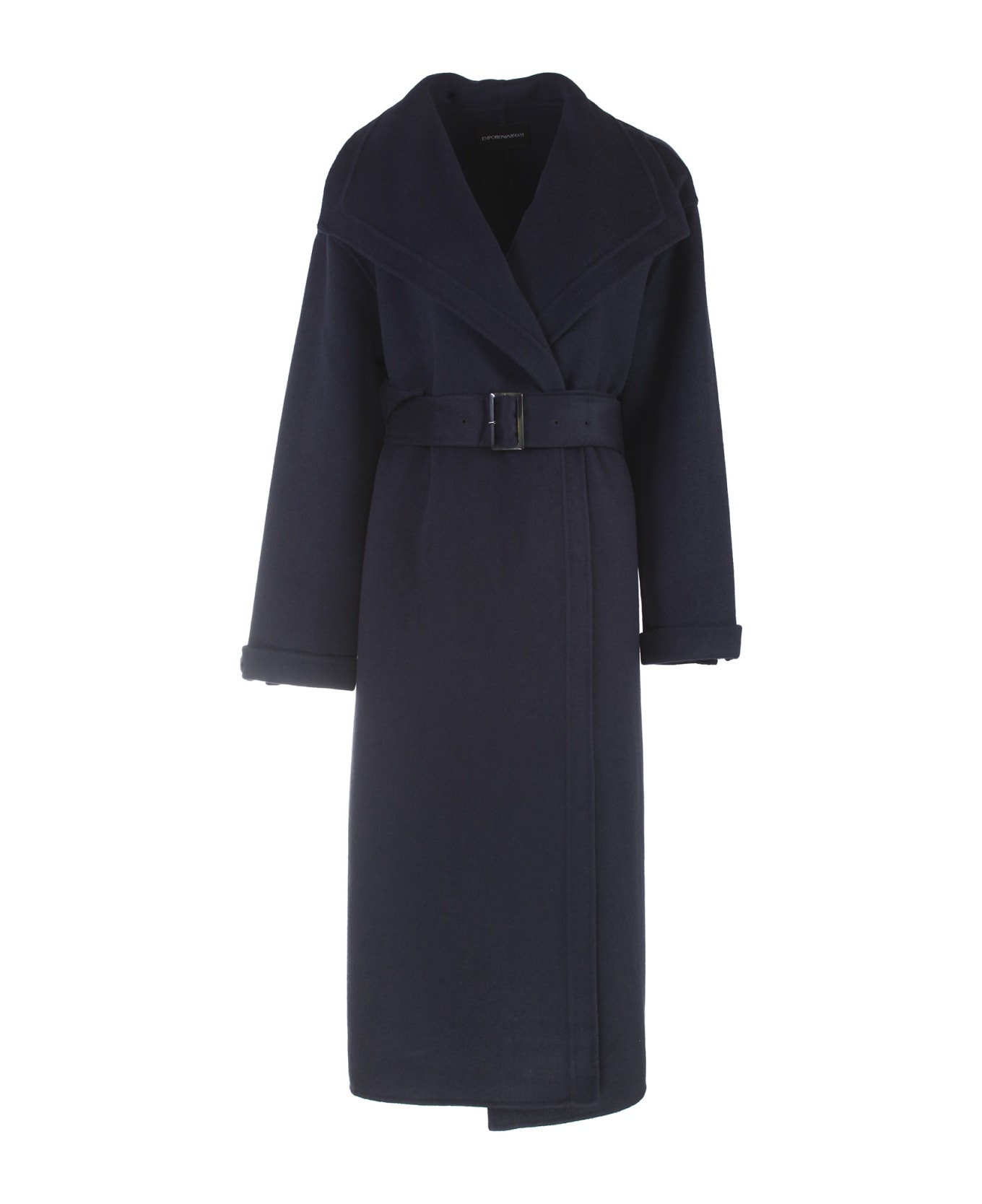 Emporio Armani compact double wool blend dressing gown coat. Composition: 50% Wool 50% Polyester. Neckline with lapels. Robe closure. Matching belt with buckle. Cuffs with horn buttons. Unlined garment. Made in China.