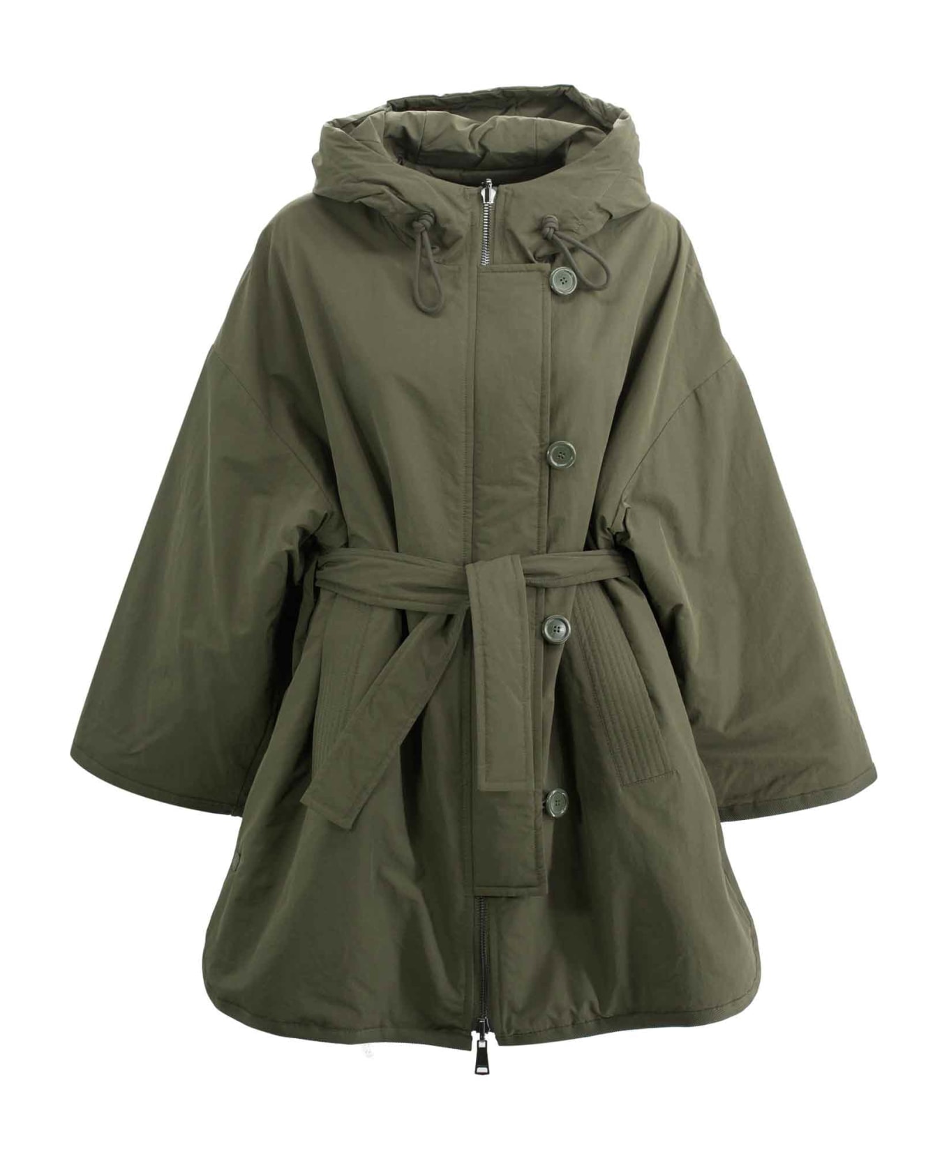 Cotton-blend belted jacket with hood, zipper and button closure.