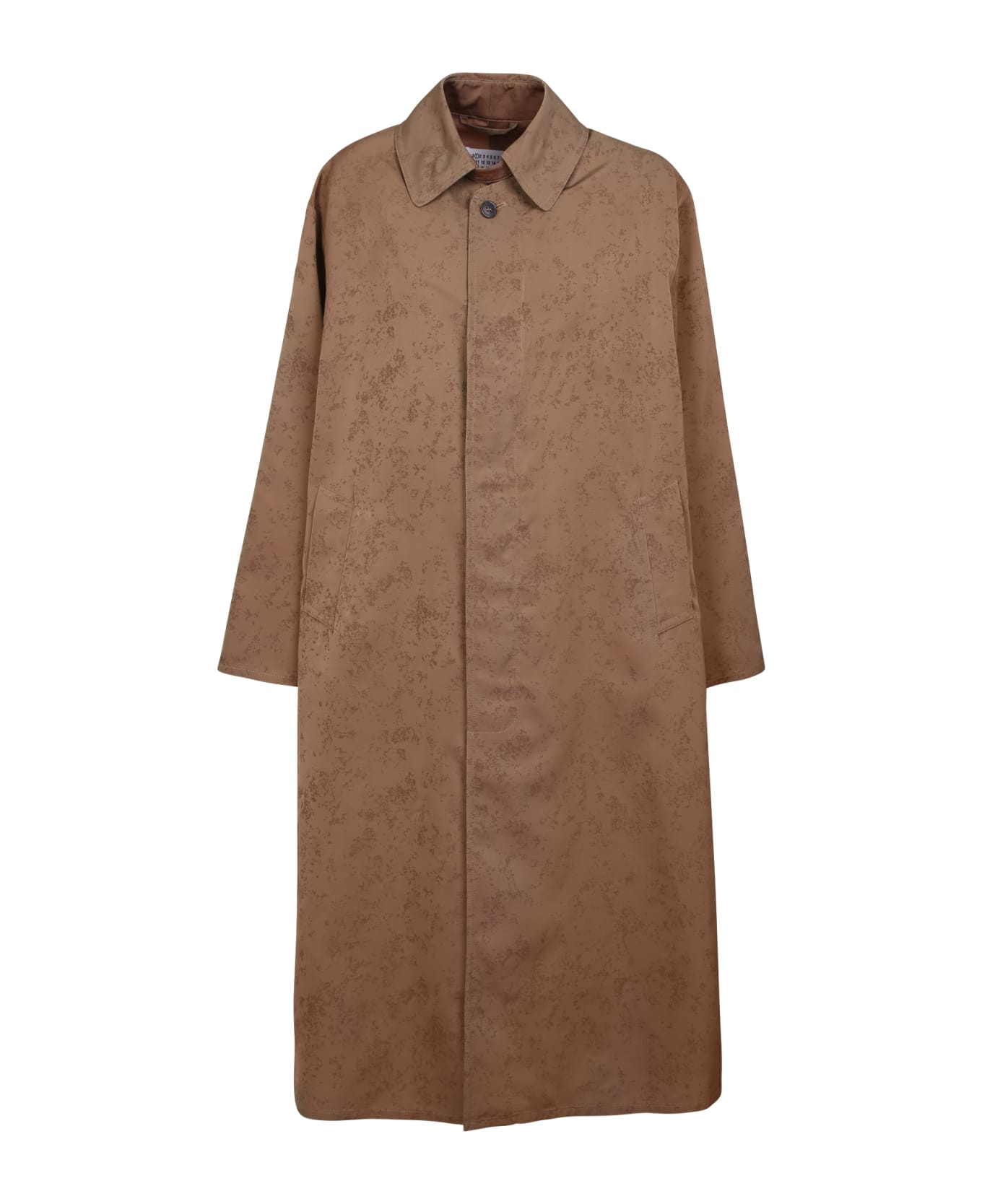 Classic collar. Long sleeves. Concelead front fastening. Abstract pattern print. Signature four-stitch logo. Slip pockets to the sides. Color: camel
