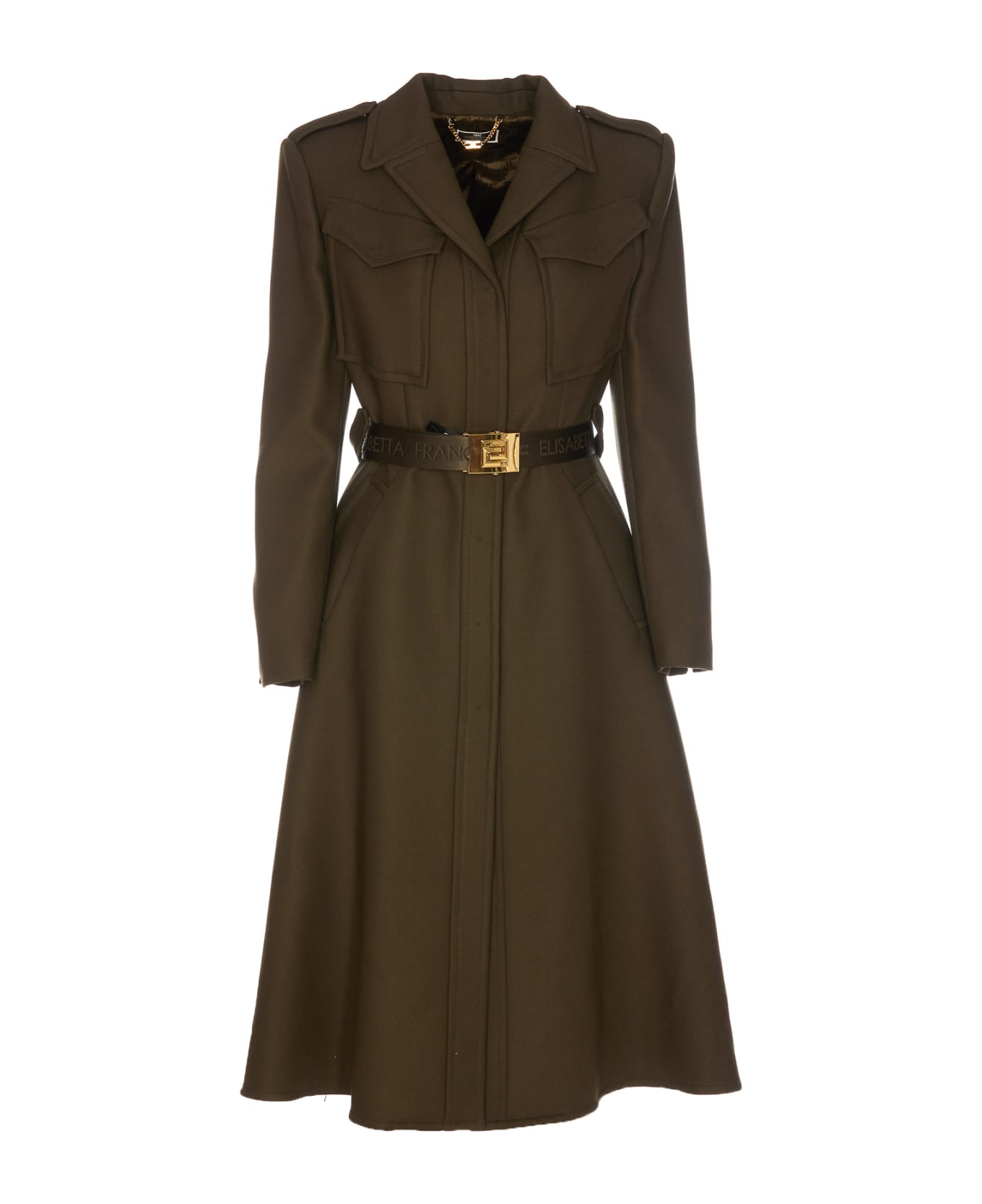 Elisabetta Franchi green coat with frotnal buttons closure, logo belt detail on wait with golden buckle closure, lateral pockets, reinforced shoulder with tabs details, mini split on cuffs, tight and long model