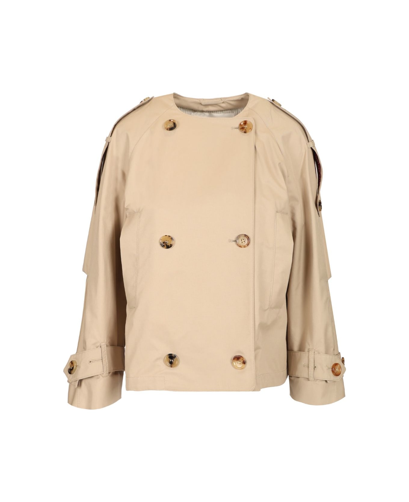Max Mara The Cube double-breasted short trench coat in water-repellent technical cotton twill with crew neck, long raglan puff sleeves with adjustable toggles on the cuffs and welt pockets on the sides. Finished with toggles on the shoulders, a central slit on the back and a cape on the back with an embroidered logo. Semi-lined model in taffeta with jacquard logo ribbon details, finished with a sartorial dot. Front fastening with horn buttons.
