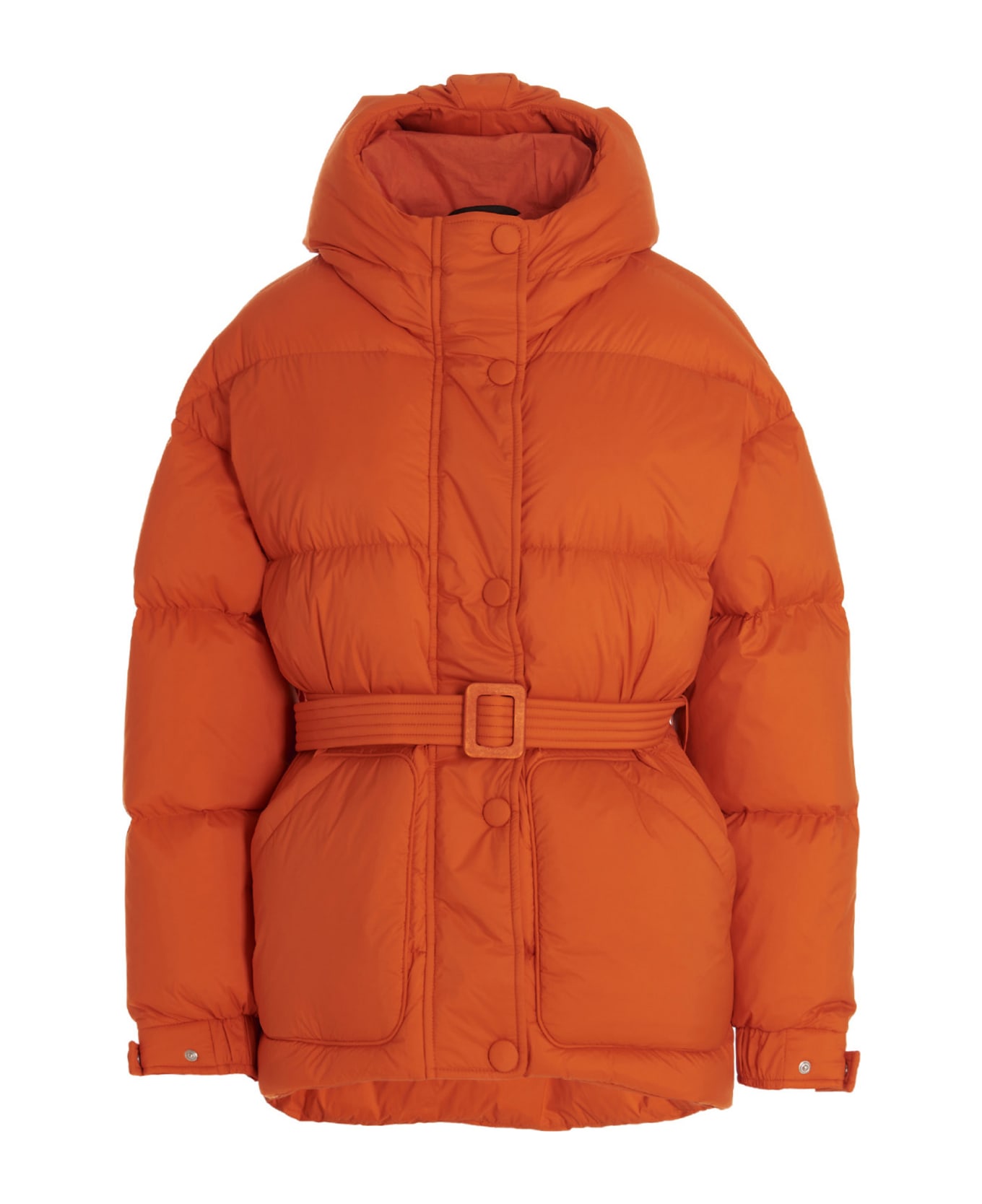 Multilin' padded nylon down jacket with button and zip closure, n adjustable and removable waist belt, hood, pockets and long cuffed sleeves.