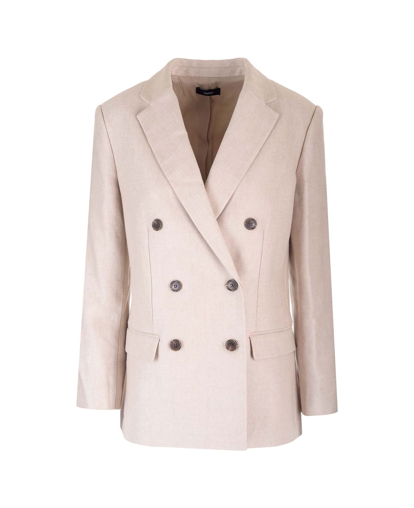 Double-breasted blazer in pumice-colored linen twill from Theory, with notched lapels, double-breasted front closure, side flap pockets and central rear dart.