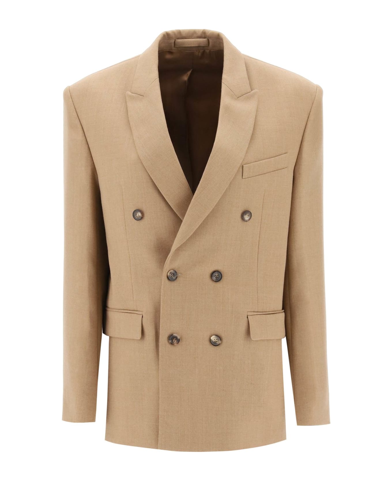 Wardrobe. NYC blazer crafted in virgin wool gabardine. Double-breasted design with six-button closure featuring peak lapel, welt pocket at chest, front jetted pockets with flap, five-button cuffs and side slits on the back. Lined interior with a pocket. Oversized fit with structured shoulders. The model is 177 cm tall and wears size S.