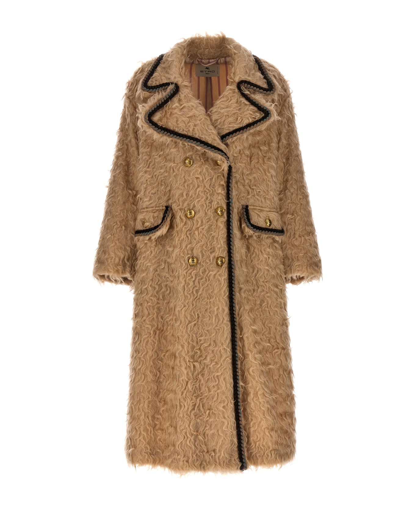 Double-breasted coat in long-haired fabric with contrasting trims, button closure, pockets, long sleeves, and back split. Composition: 35% wm 35% ac 30% pl